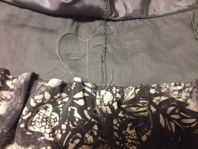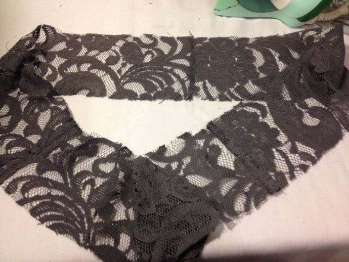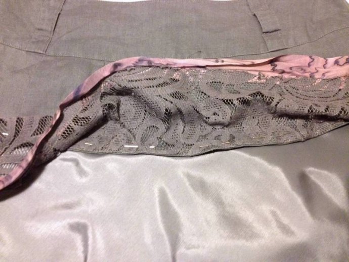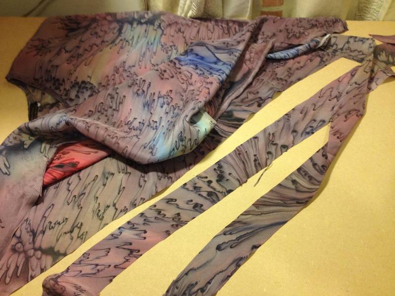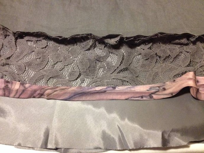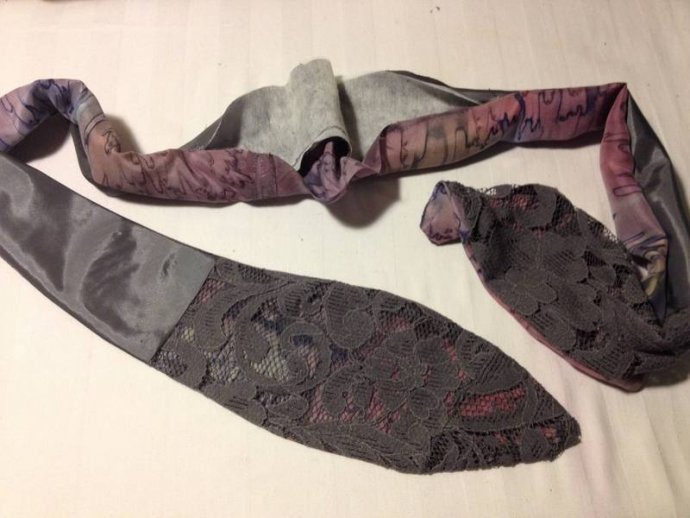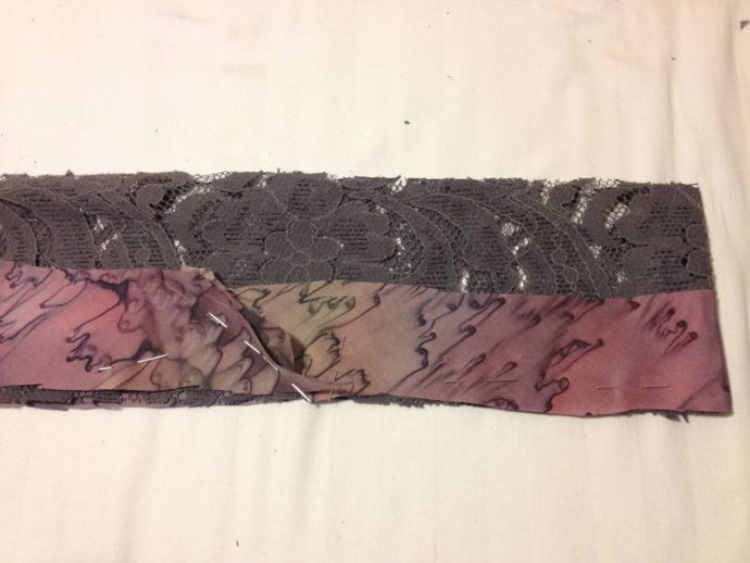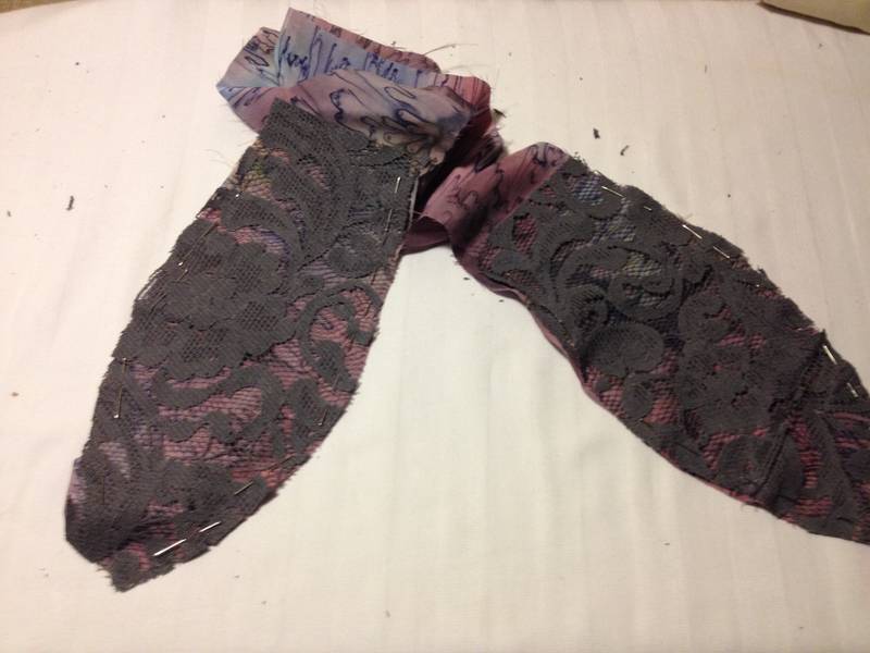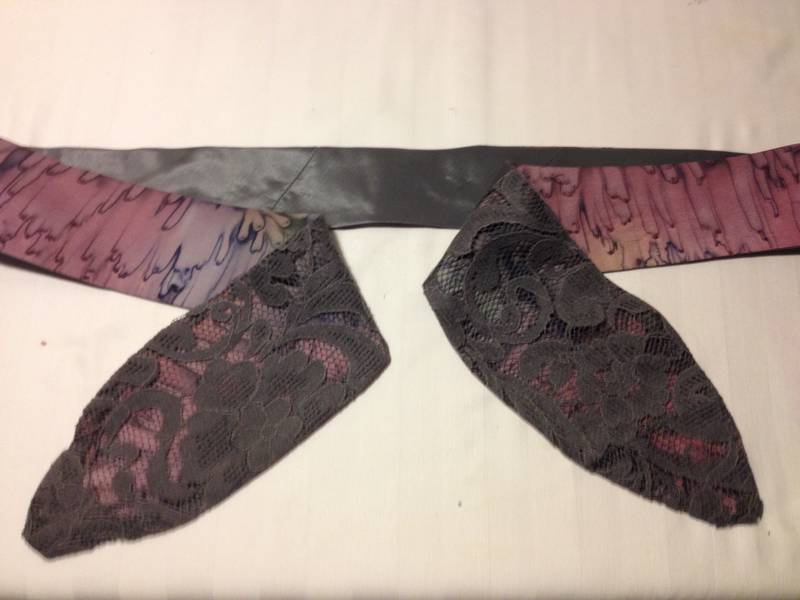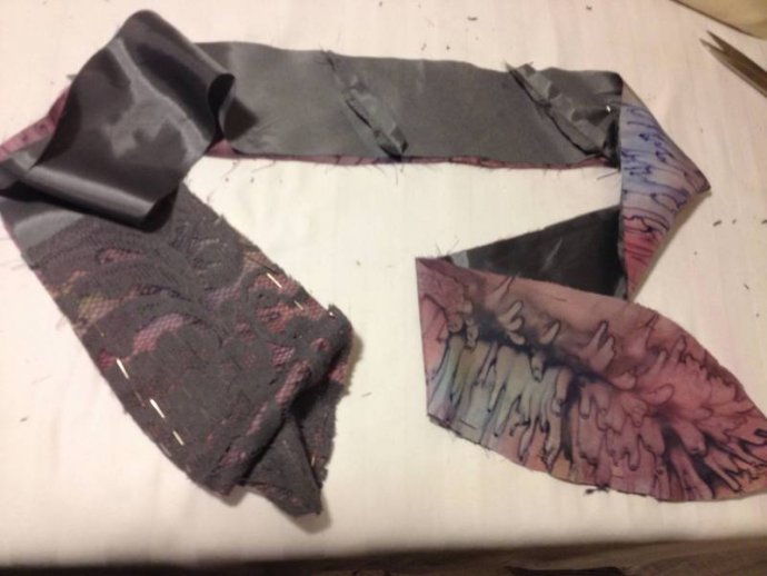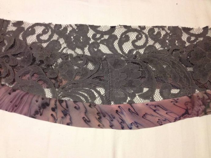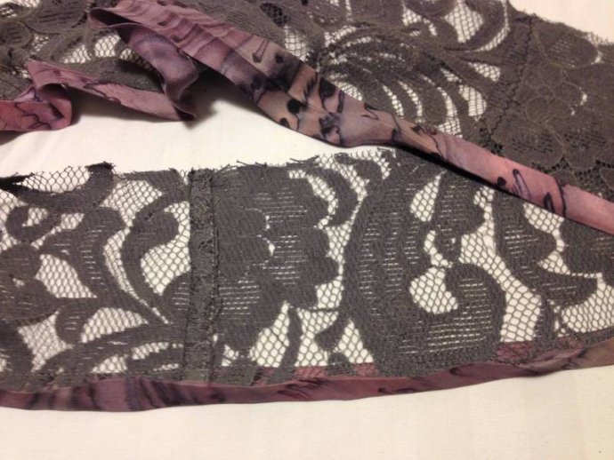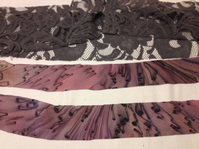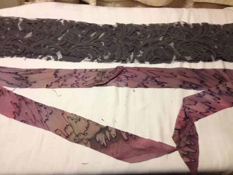 Cutting layer pieces: grey lace with added mauve silk print edge trim.  Cutting sash lengths and machining, turning inside out showing mauve silk print one side.  Its useful to buy up silk blouses when spotted in thrift shops, as they make good bias cut bound edges for many applications; sashes, collars, hems, sleeves.