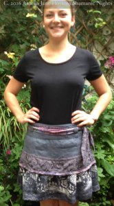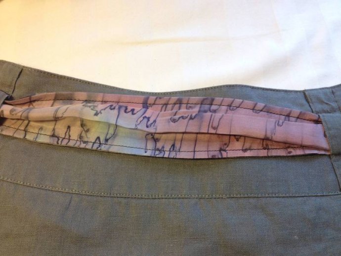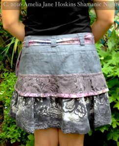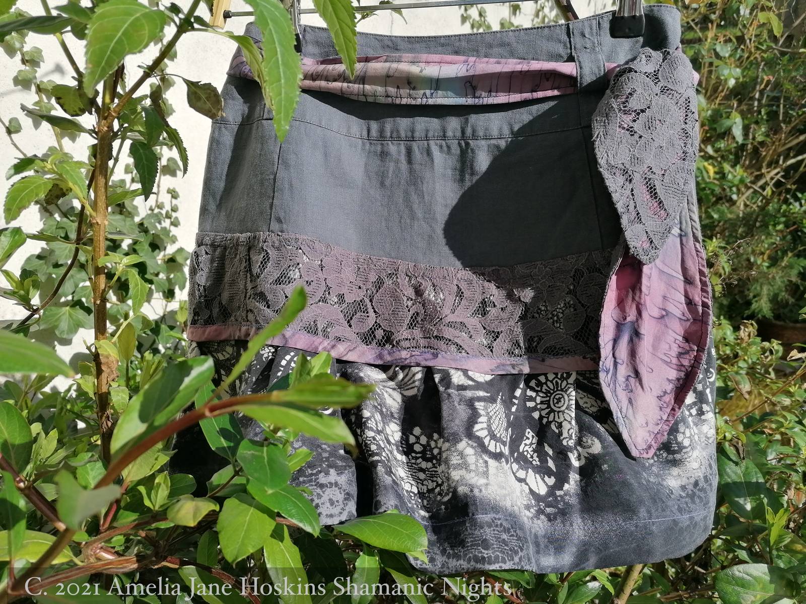 Skirt A  Grey linen with silk and lace sash -  Linen upper layer: mauve lace layer: grey/white lace print layer:  sash of grey lace and marbled lilac silk, as feature.