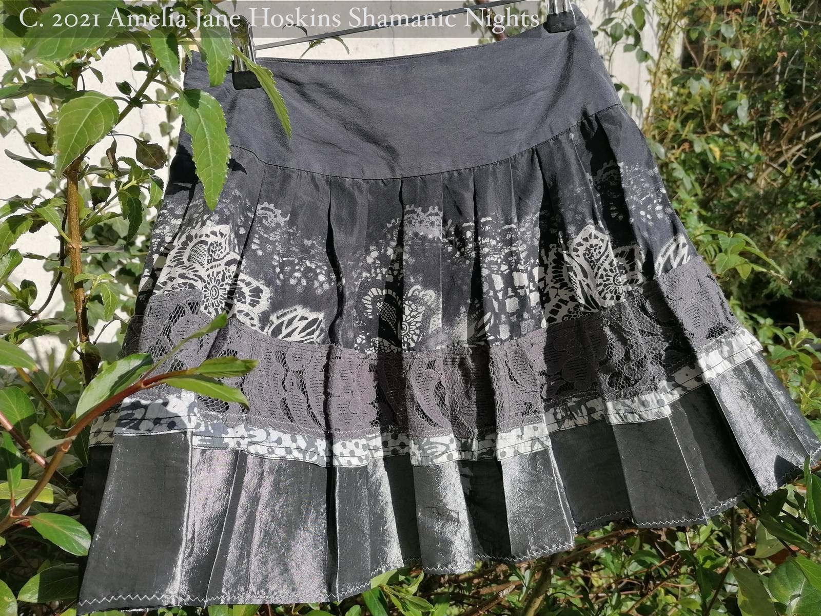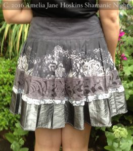 Skirt B  Grey pleated lace print - Silk upper layer: grey lace layer: silver pewter taffeta layer. Pleated flare.