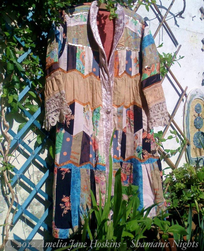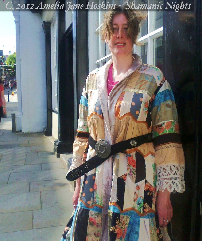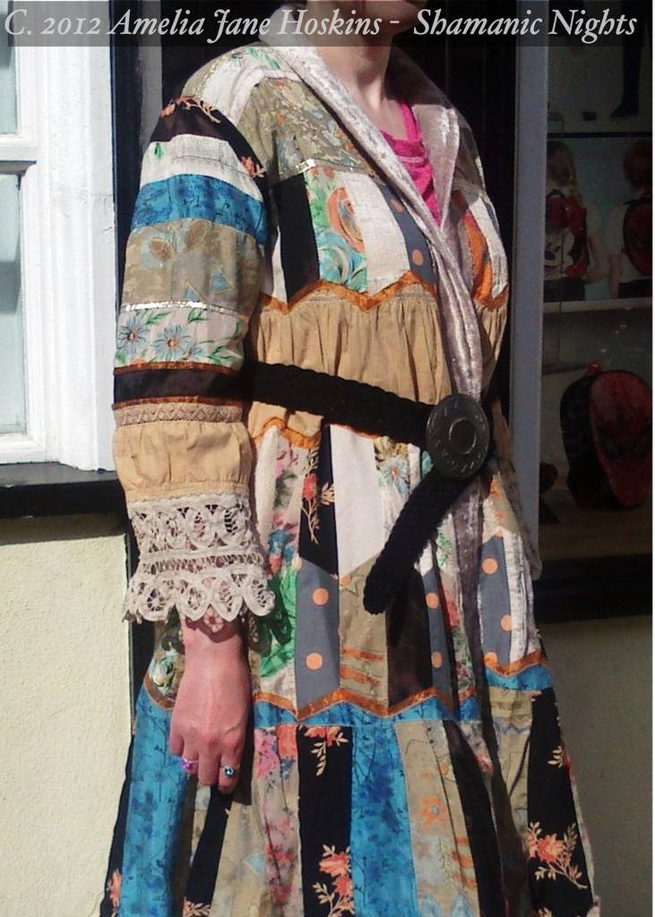 Very detailed patchwork was an enjoyable experiment for me, as I so enjoy working with the colour juxtapositions.  So unique, I was happy Simone, who had recently moved to Totnes, liked it so much.  Price was around £200.  Robes do not get repeated as they use a collection of fabrics; which serve to show the kind of visual effects achievable.