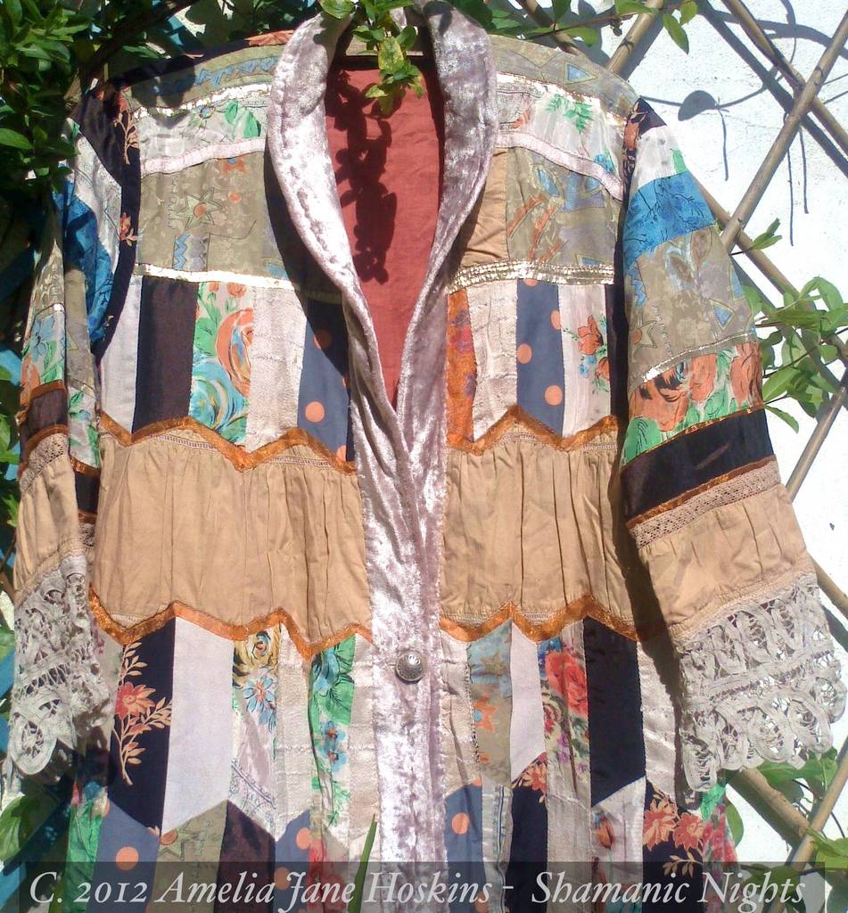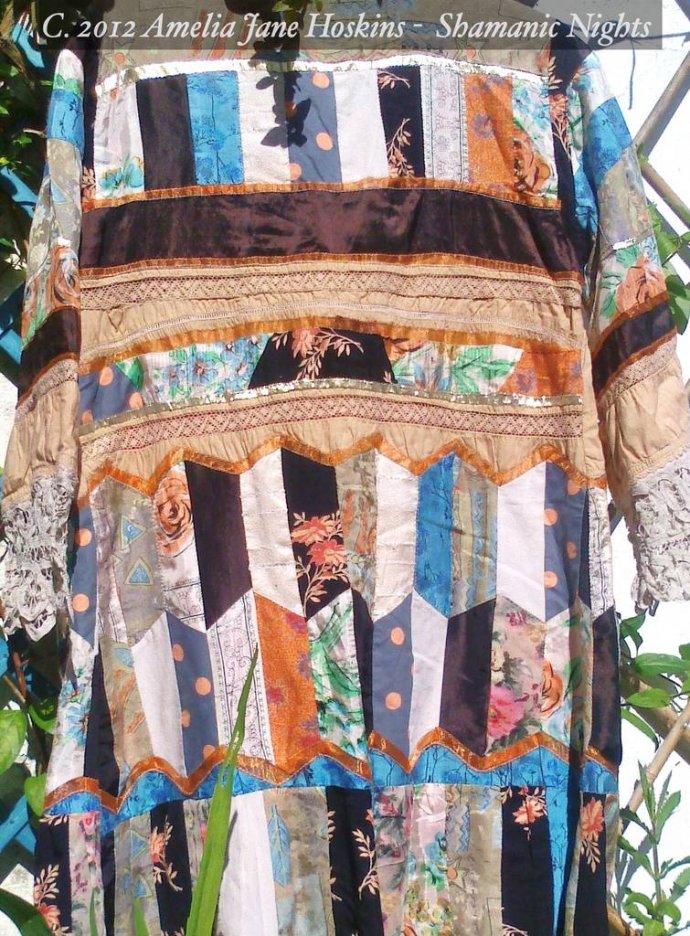 Patchwork is created using small scale trapezoids which create zig-zags where rows joined, and give overall 'herringbone' appearance.  Fit was made by using a gathered golden cotton layer from bust line, which gave fullness for the lower garment. (this is useful design-fit ploy which could be copied).   Lined in dark orange soft cotton voile.  If spending a long time on a valuable patchwork, line it with cotton, rather than polyester. (new cotton voiles are available in all colours from fabric suppliers).  Nowadays I only used recycled fabrics for linings also.