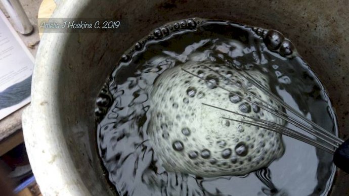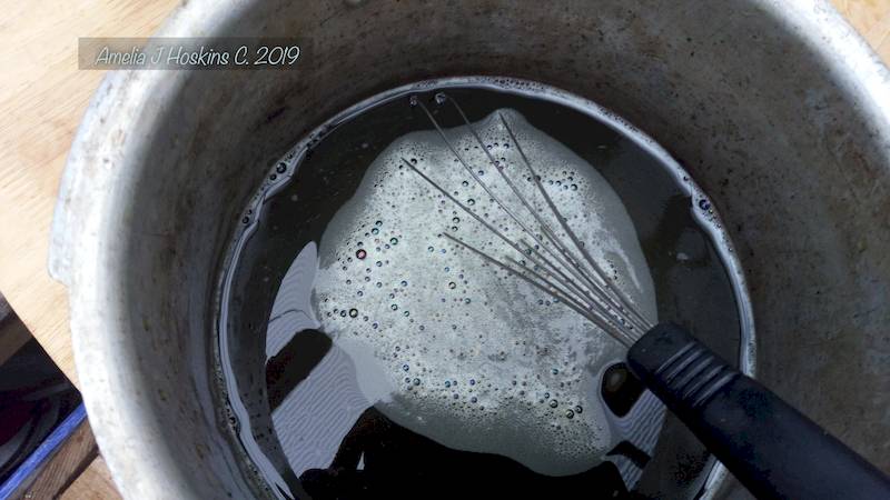 An important part of the process is to whisk the dye bath after addition of soda crystals at 50 deg.  Bubbles take a while to form and must be whisked continuously to achieve a foam over dye bath.  It may be cream, or slightly green coloured. Blue-green is described in recipes but dull cream still gives a blue result.  Click to enlarge.