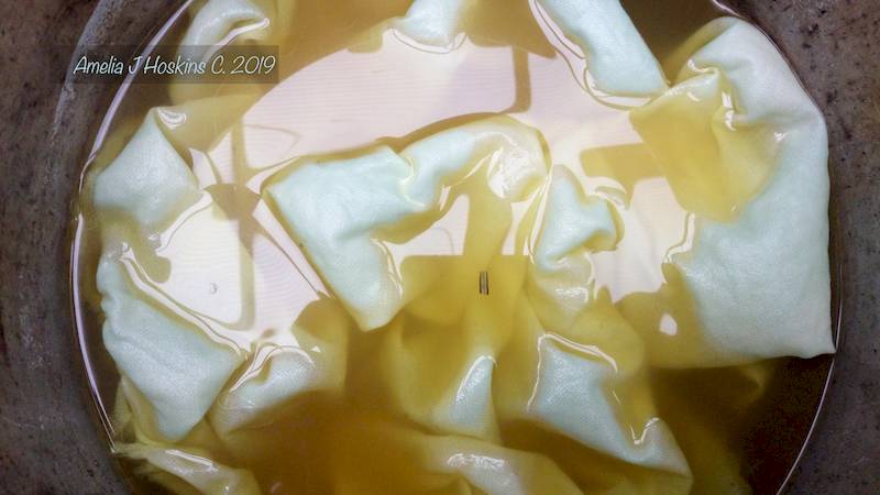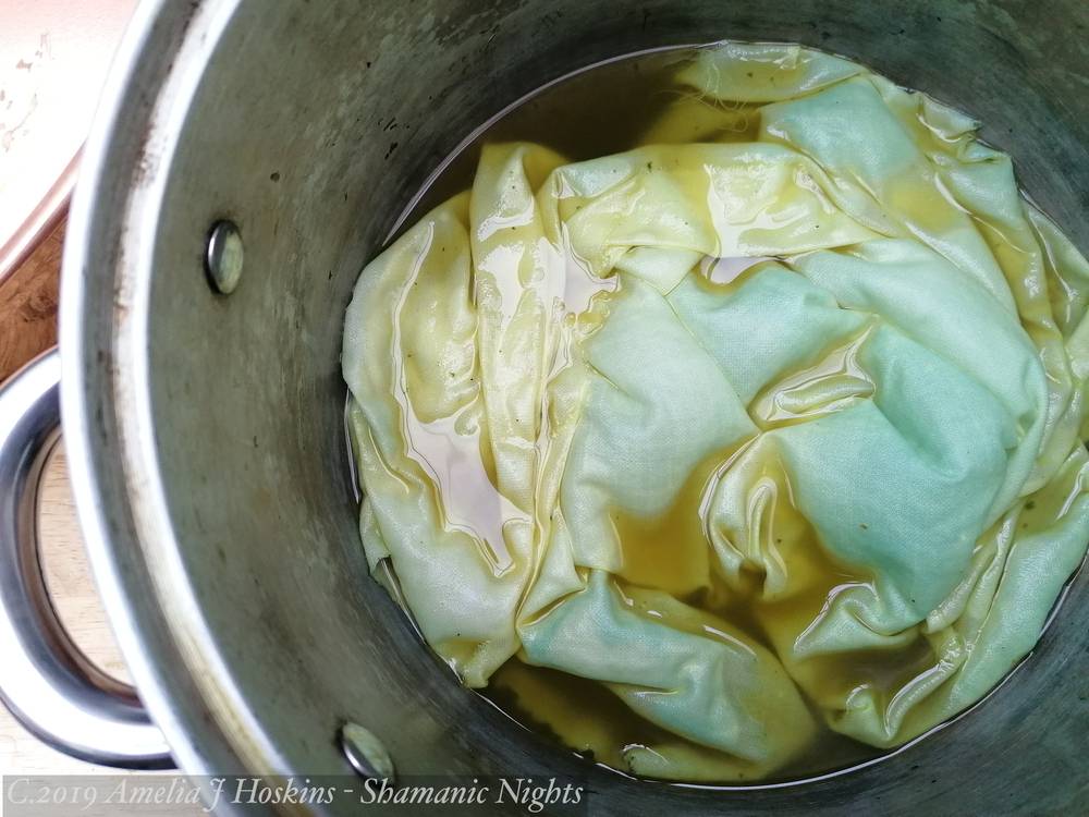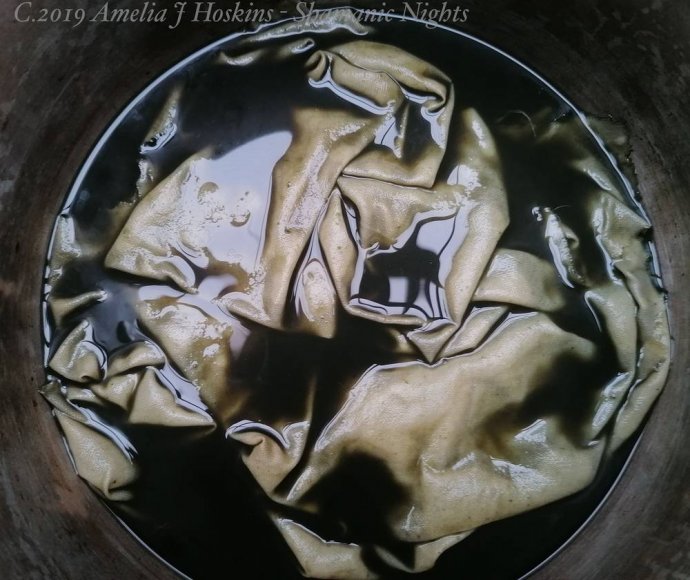 • Place silk in liquid carefully without creating air bubbles. Submerge. Leave for 20 mins.  It starts to work soon if some fabric is left out in the air (see Process Main Gallery).