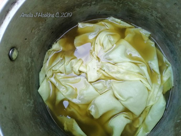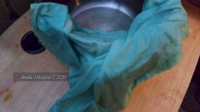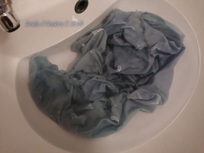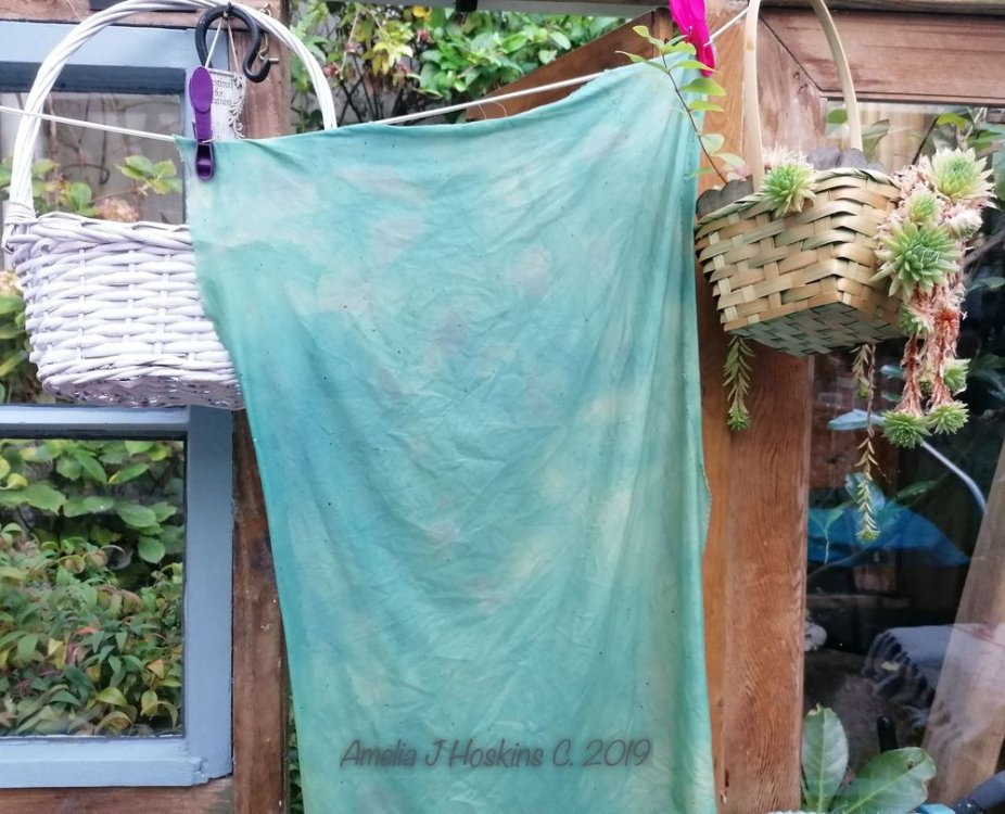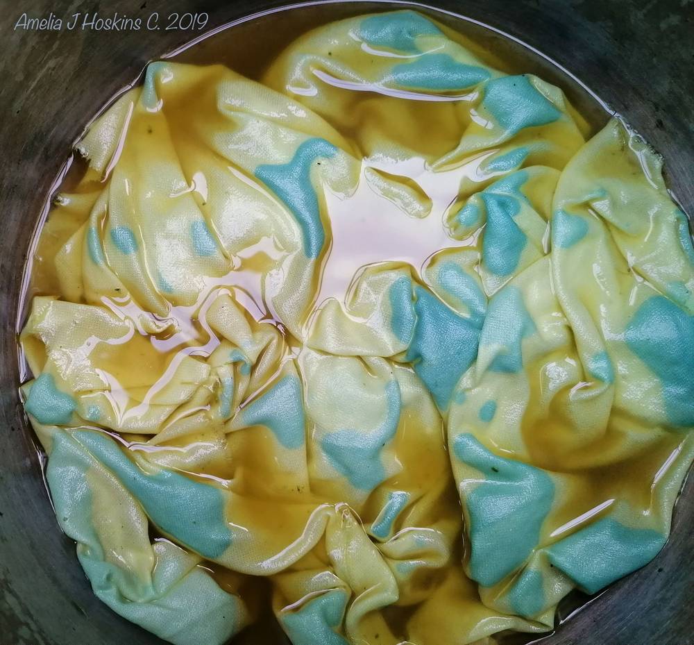 • Remove fabric and rest it. Watch it turn blue in air. (mine went turquoise on ahimsa cream silk using pond water).