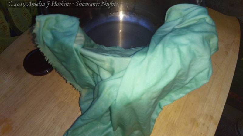 Note: I returned my 1st session dyed cloth to the dye bath, which then REVERSED the process (as recipes warn).  Best to leave in air and rinse much later.