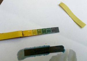 A second dipping of litmus paper shows how the soda crystals has changed the dye bath to required PH9. Even pH11, achieved with pond water. Qualities in pond water might be evidence of my deep turquoise initial result.