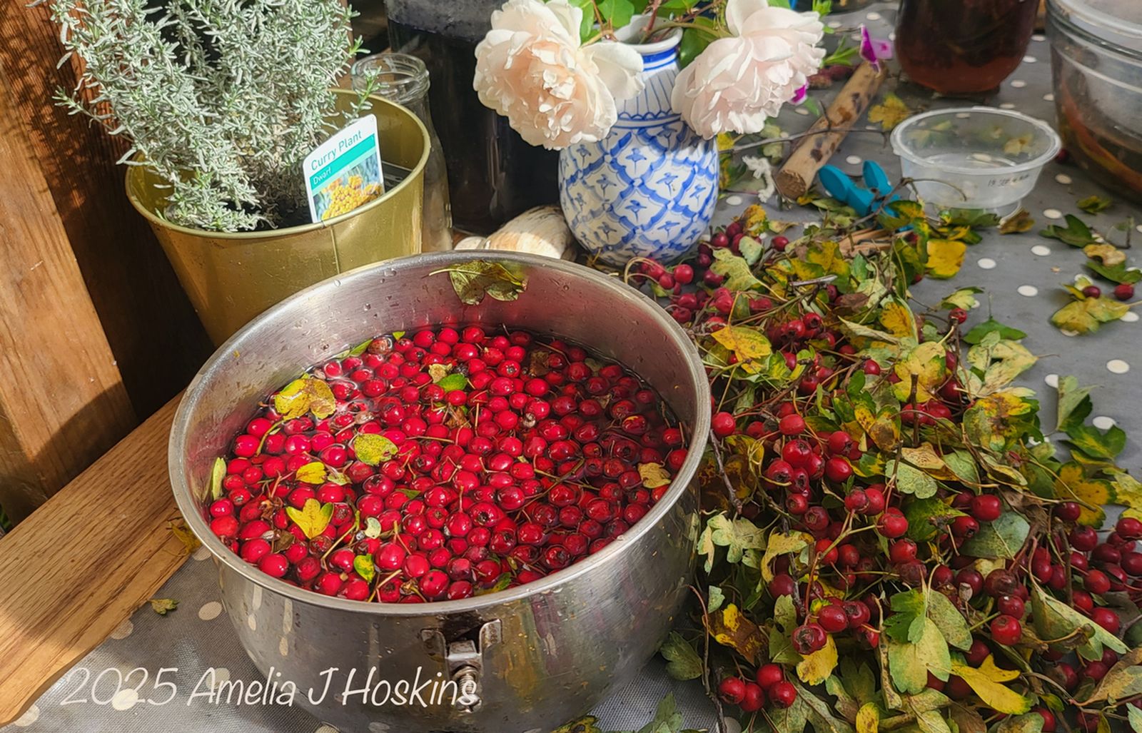 Two pickings: October Berries picked when bright red, when leaves still on branches, and November, when only the berries are there; easier to see and pick, but they are darker red, which I think leads towards lavender results.