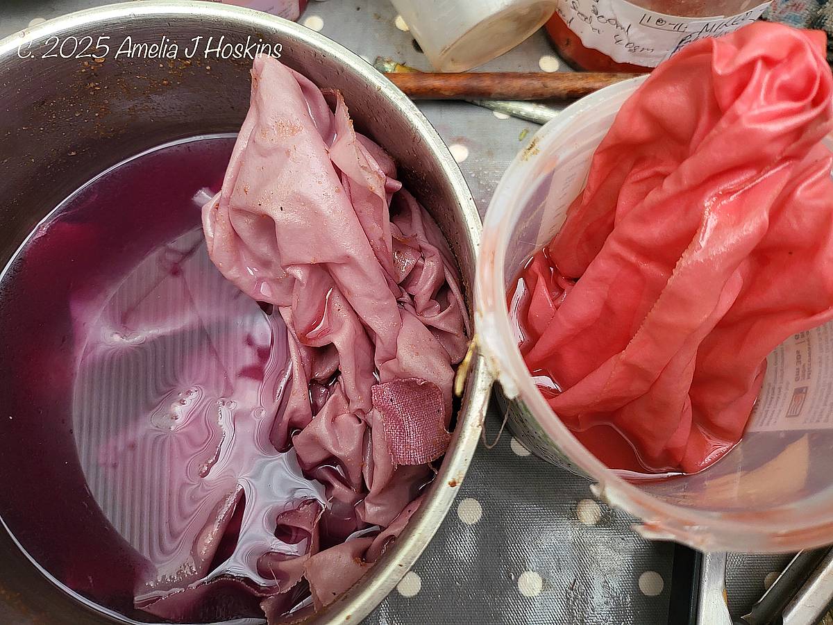Red habotai silk result is from soaking in hawthorn berry dye bath modified with citric acid (at least 50 grams to 250ml dye liquid). Weaker lavender silk soaked in non modified dye bath, but pre-mordanted in Alum Sulphate. Weaker result because the first Erin dyed silk took most of the pigment strength.