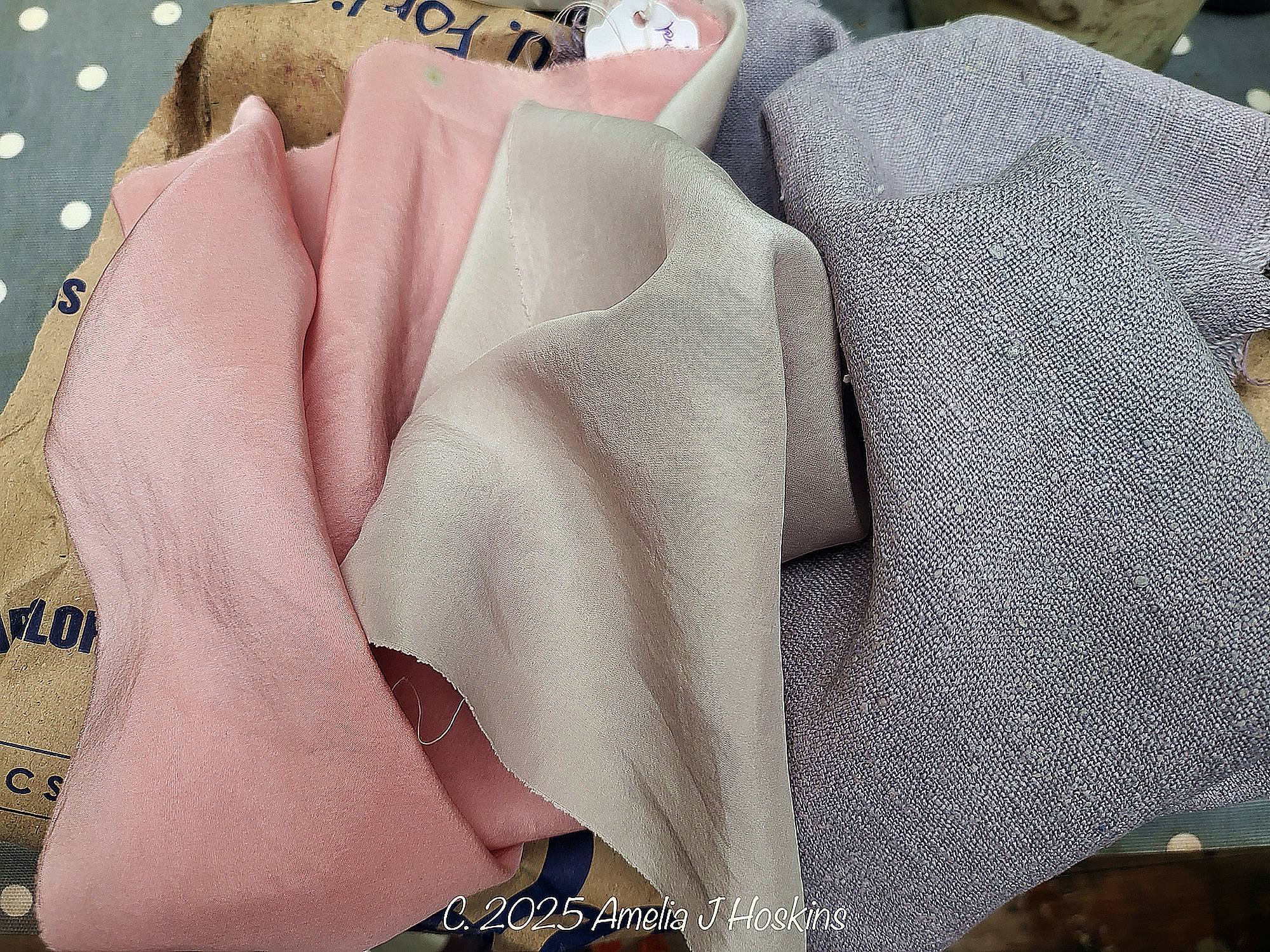 Erin silk (right) first soak in the dye; result dark lilac on drying. This may fade to more pink. Middle silk grey result as second soak. Pink silk is darker (photo didn't catch it)