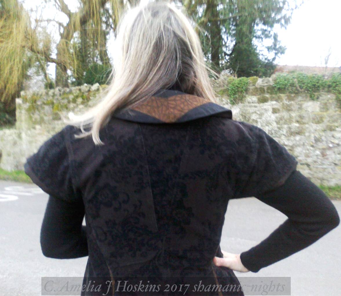 Side vents were used because the beige fabric is taken from trousers, using the top part across the shoulders, with leg sections tapering down below hips.