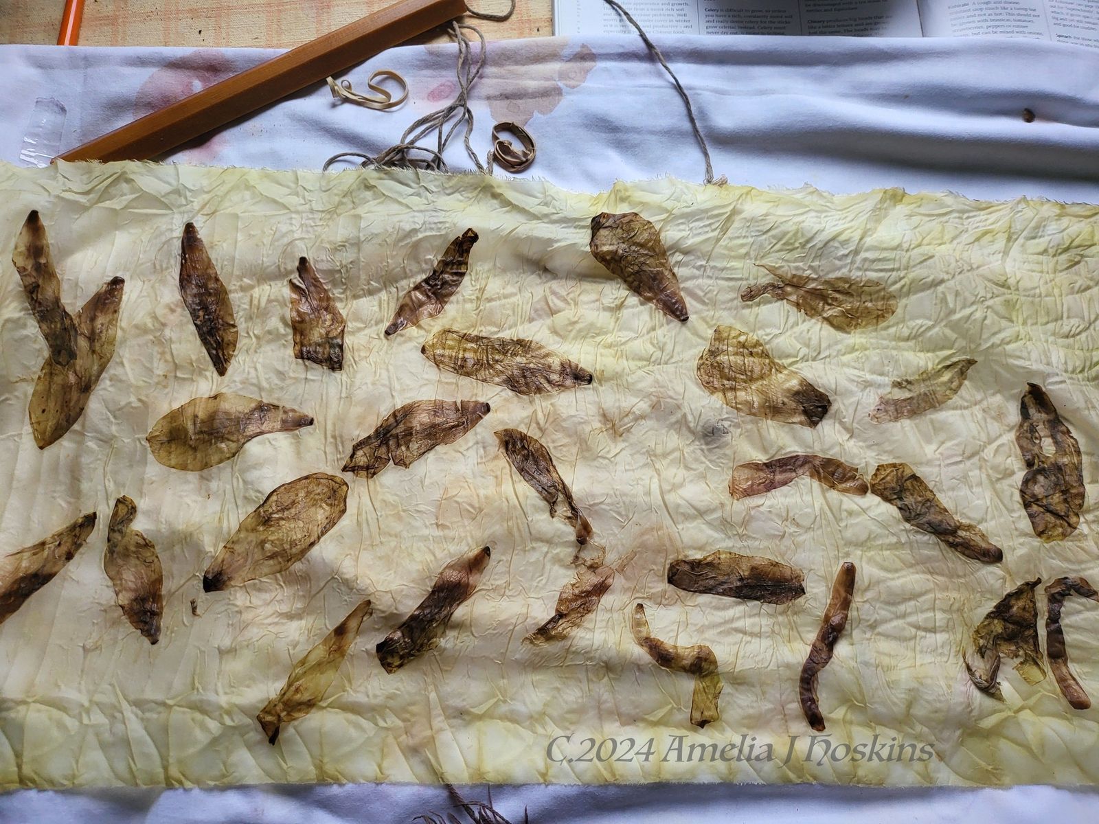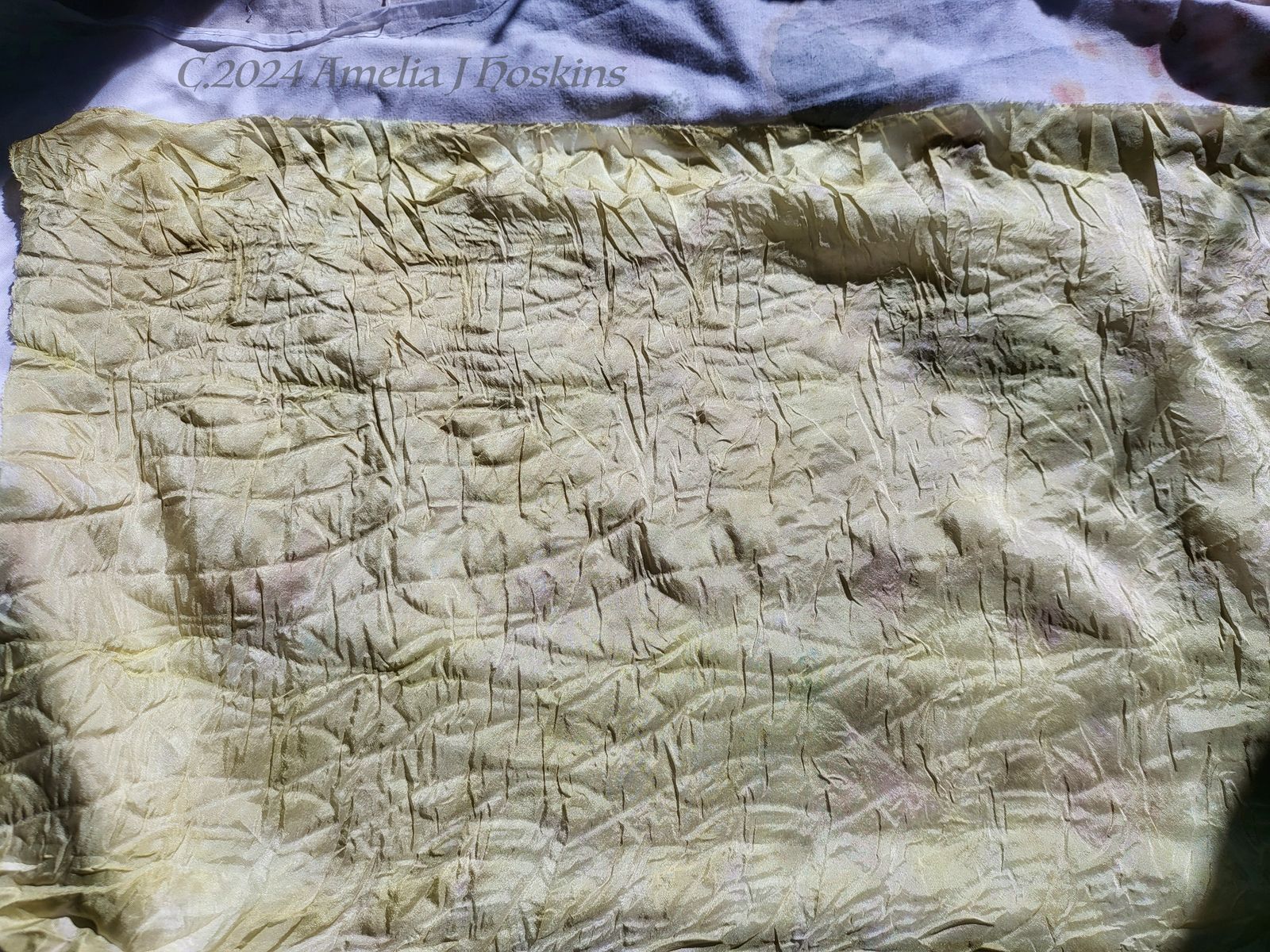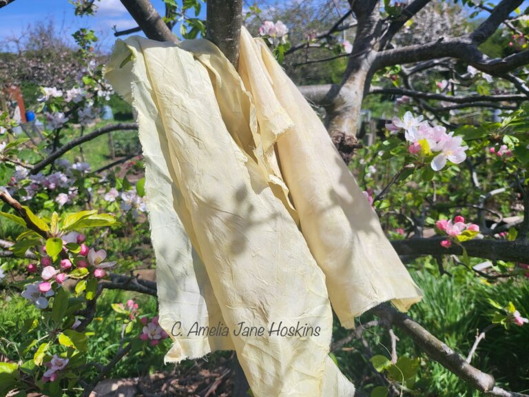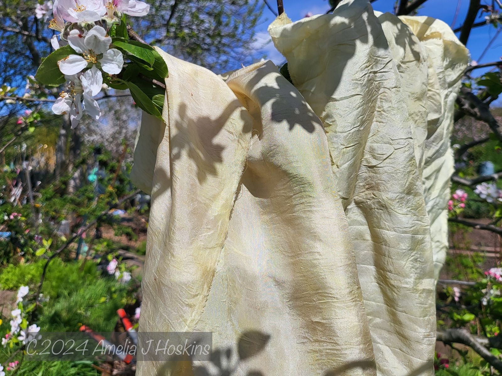 Silk in apple tree shows the brightness of the yellow in sunlight. The piece bundle dyed with razor shells shows slight browning from the petals.