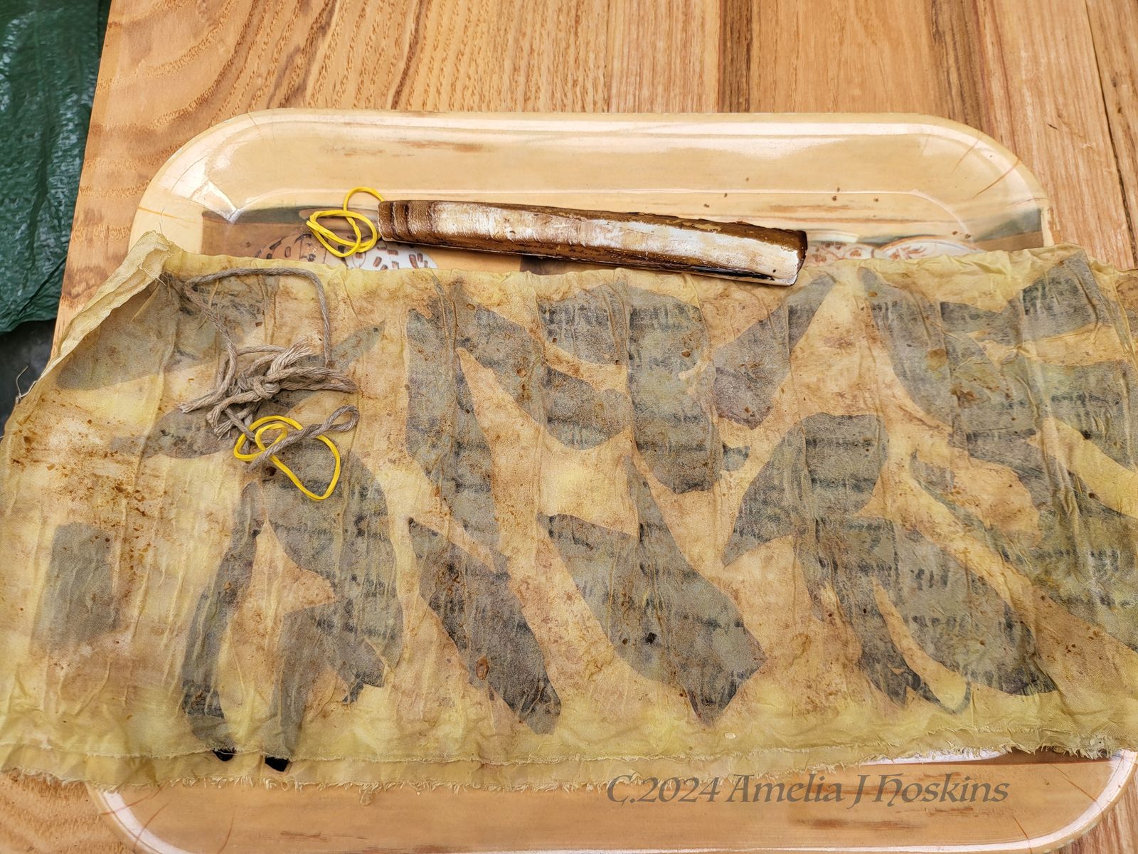 Silk wrapped around wood or stick, with string and rubber bands. A second bundle was made with razor shells as a base. Silk pieces were quite small and folded over to trap petals. 2nd dyeing produced some feint brownish areas from the second dye with petals. Click to open gallery view
