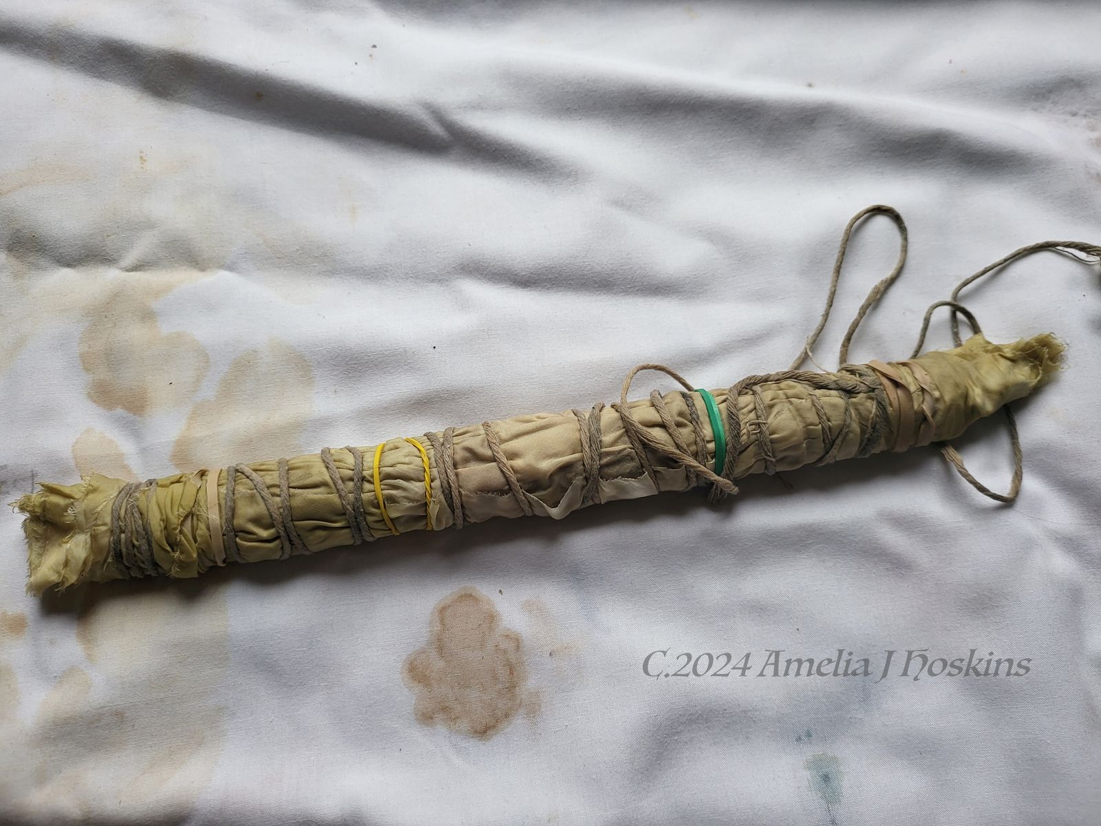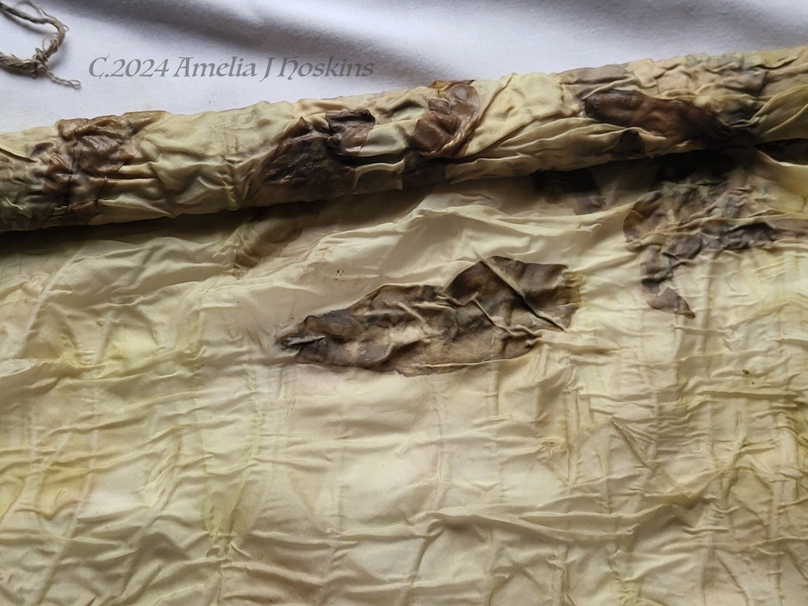 Dried petals (browned) wrapped in silk which was previously dyed with boiled magnolia petals, producing a bright shiny Naples yellow. Petals were white with purple centres.