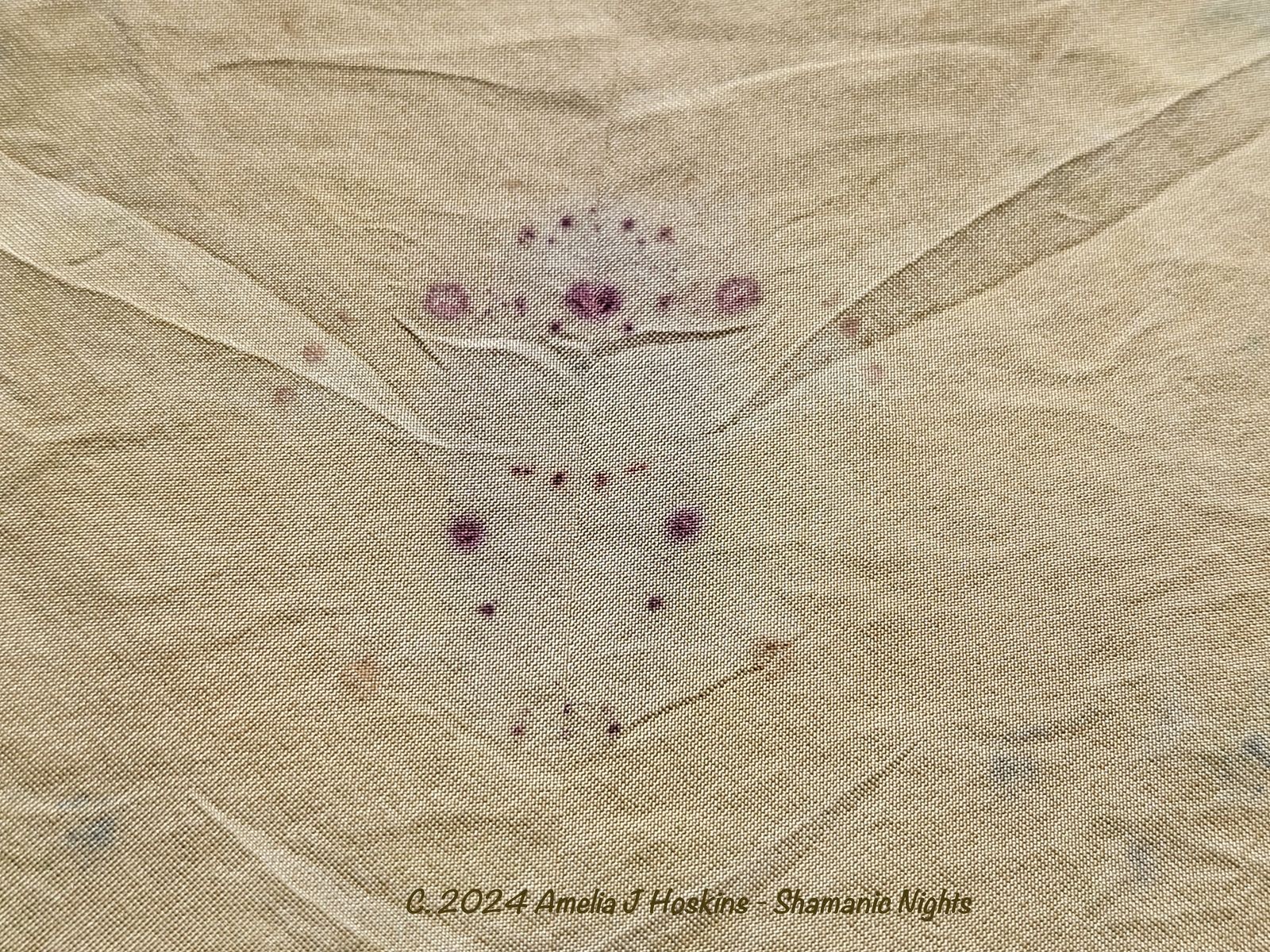 While folding over, area was sprinkled with vinegar/water weak mix.  (too strong vinegar can causer yellow-browning).  Queen Anne's lace was sponged with rust water.