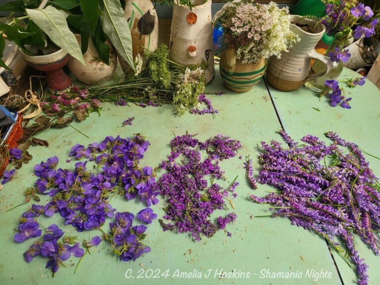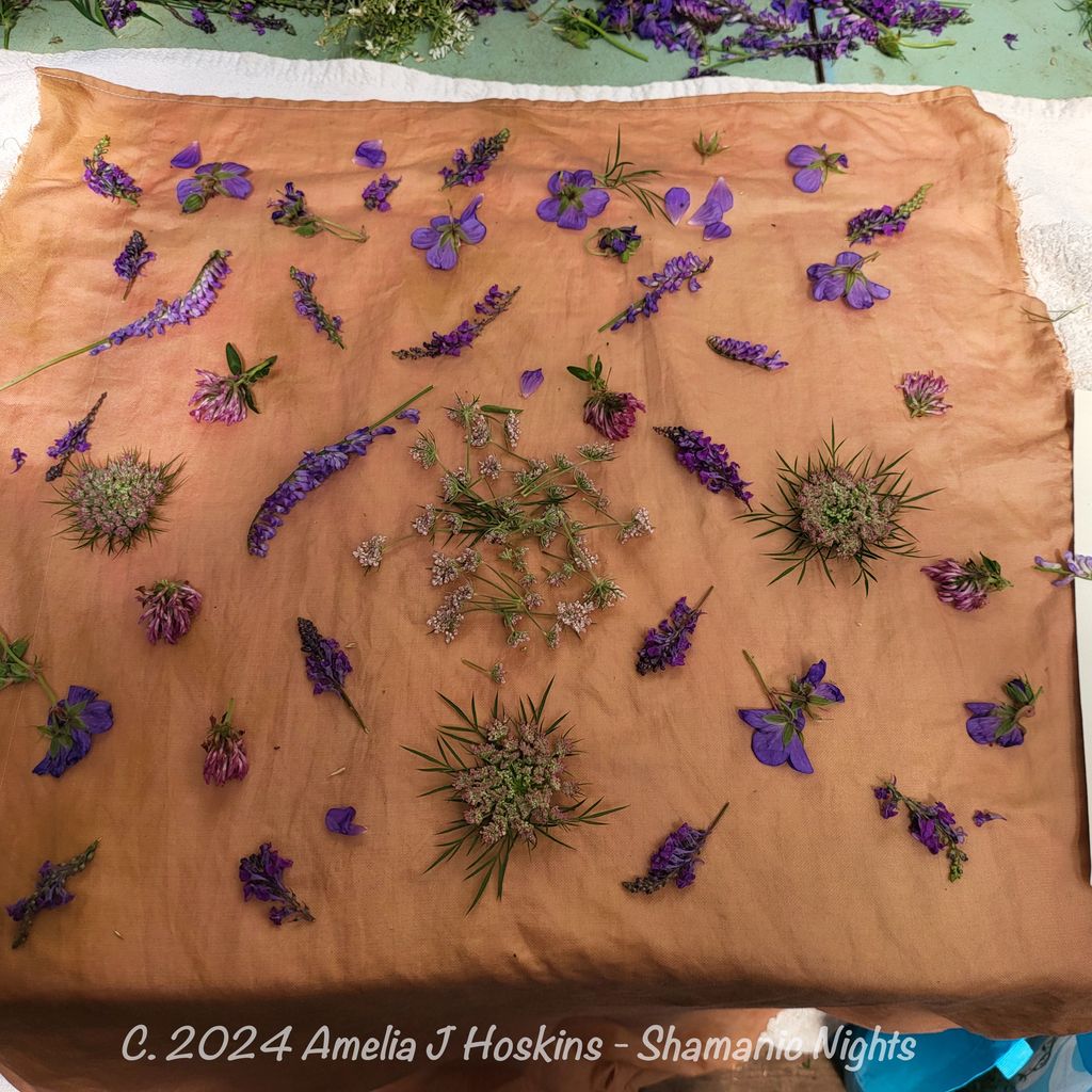 Experimental bundle dye to see what 'takes'.   Foraged purple flowers.  Linaria flowers were almost seasonally finished; so tried purple vetch also, still massing into flower.