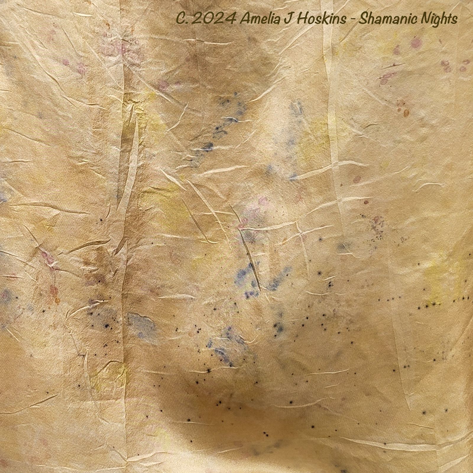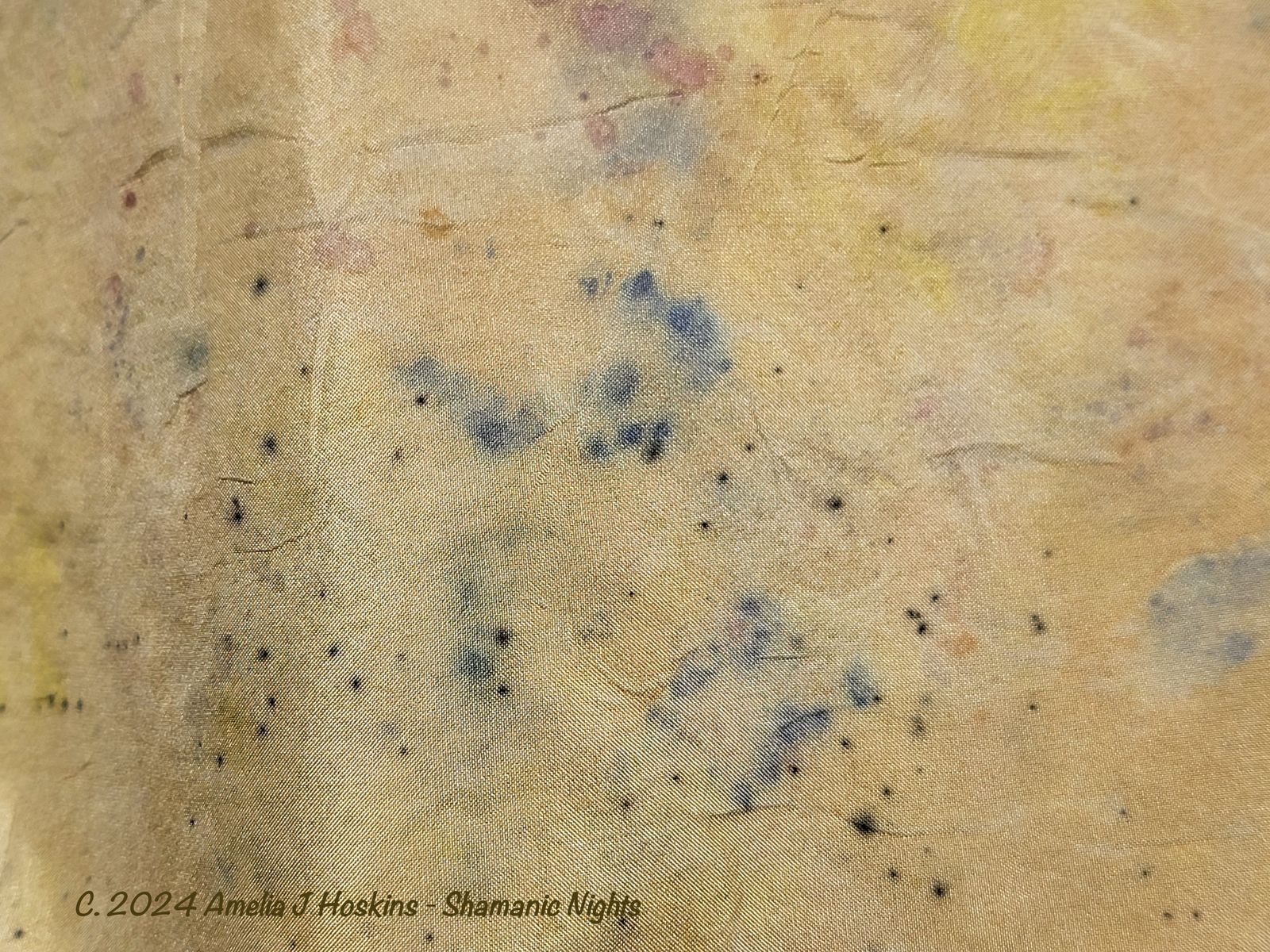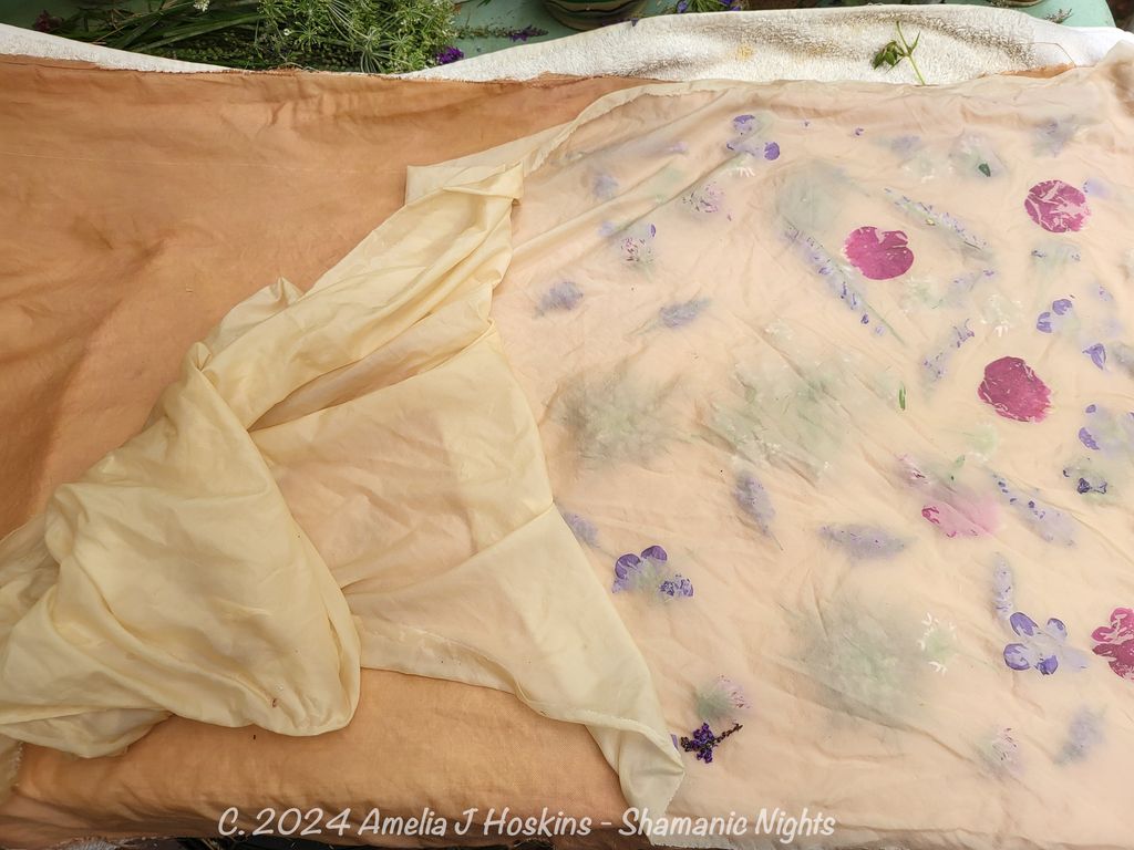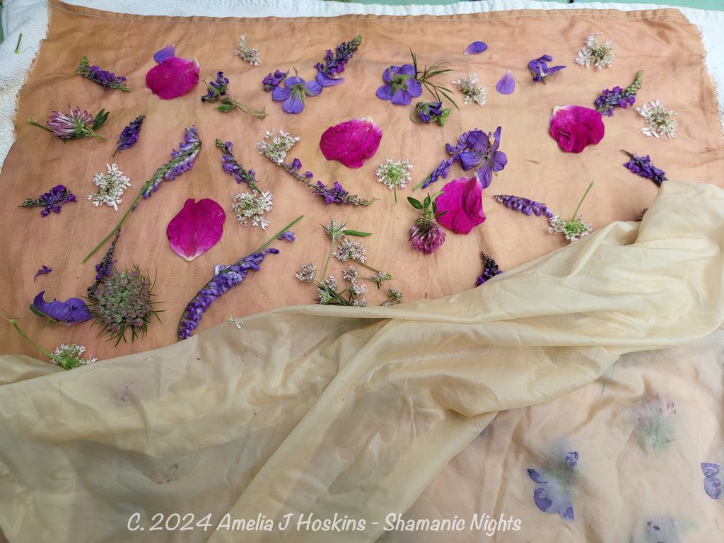 Mirror prints appear on darker gold Ahimza silk, but feinter.  (Ahimsa was not soaked in Alum, but was briefly soaked in a weak magenta acid dye.  (A tip from another dyer that a pre soak in an acid dye will increase density of floral 'prints'; especially if iron modifier used).
