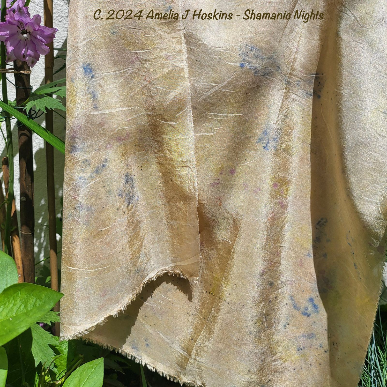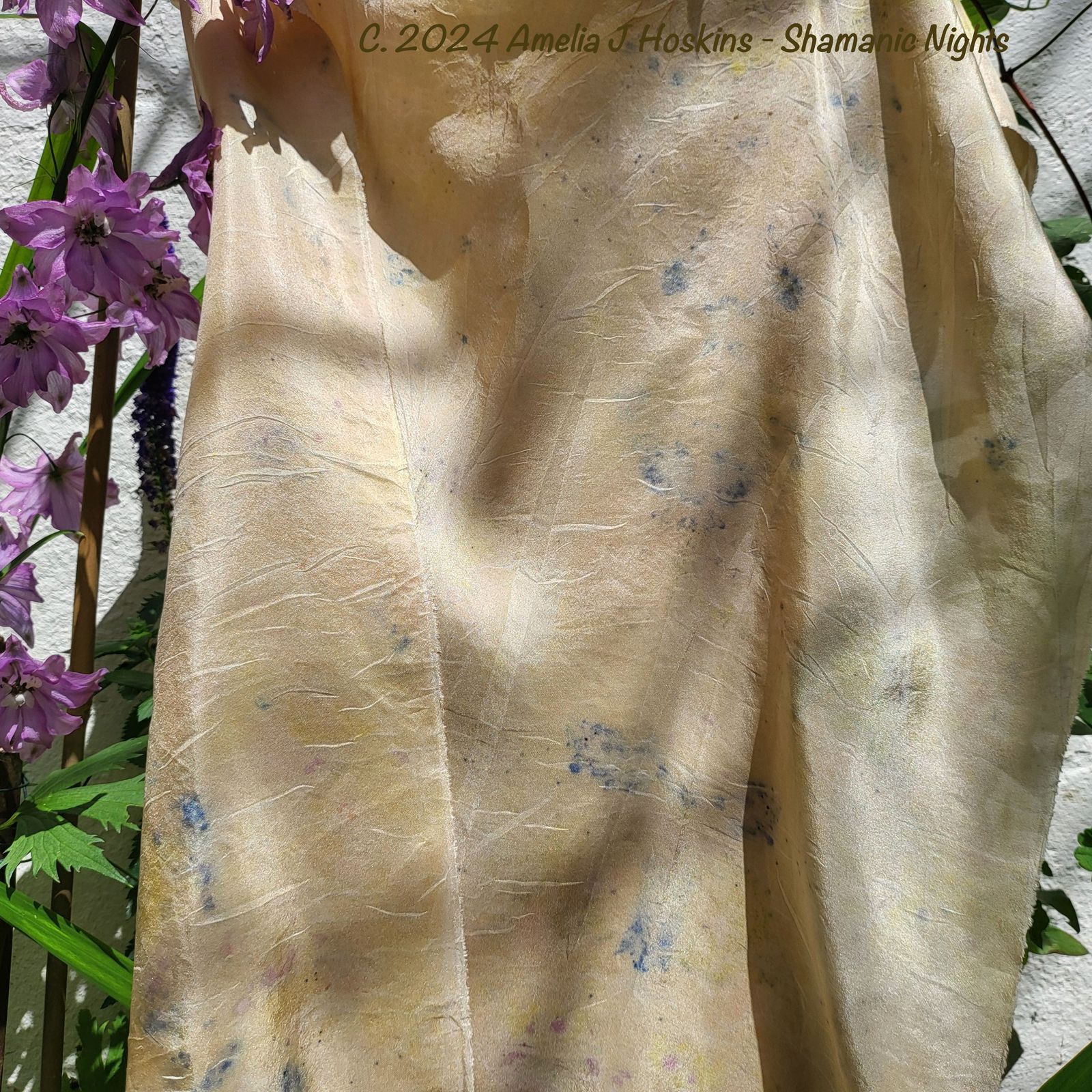 Linaria (semi wild) produces a very good dark blue, in places 'Prussian' blue shining turquoise, in blurred shapes from the tops of Linaria flowers.  Speckles can be seen where I broke and scattered linaria flower heads, giving dark blue-black dots.  Shapes created by blue dye are in places mirrored due to the folding of the Habotai silk into three, together with a 'blanket' of Ahimsa silk.