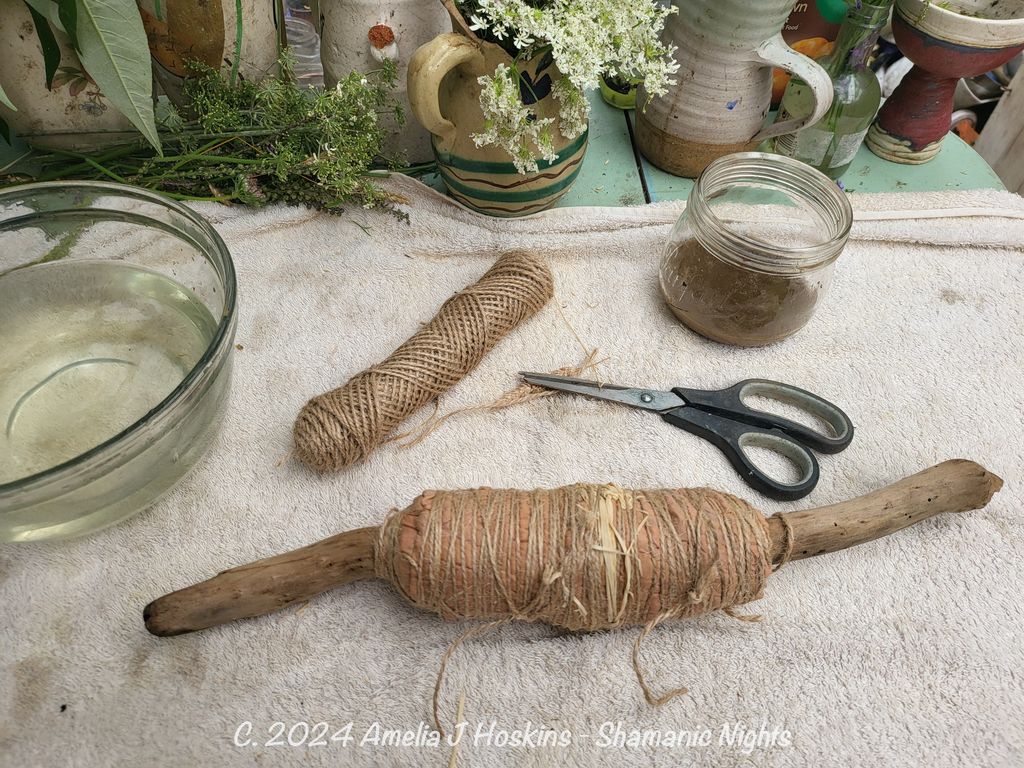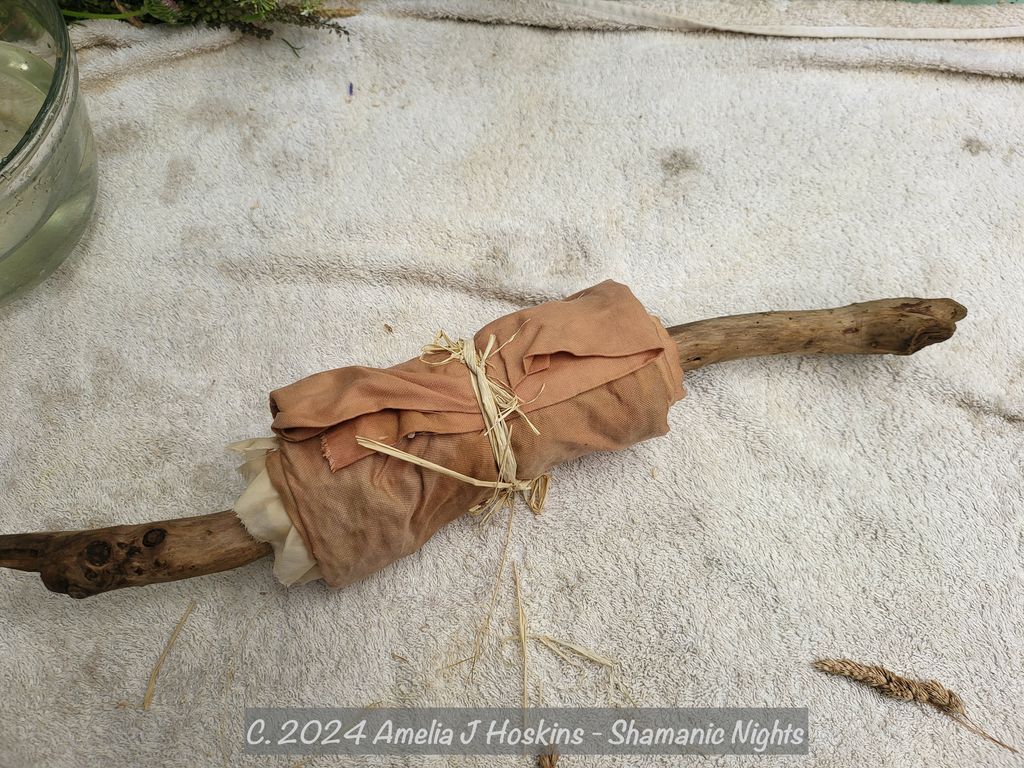 Two silks wrapped around branch with string
