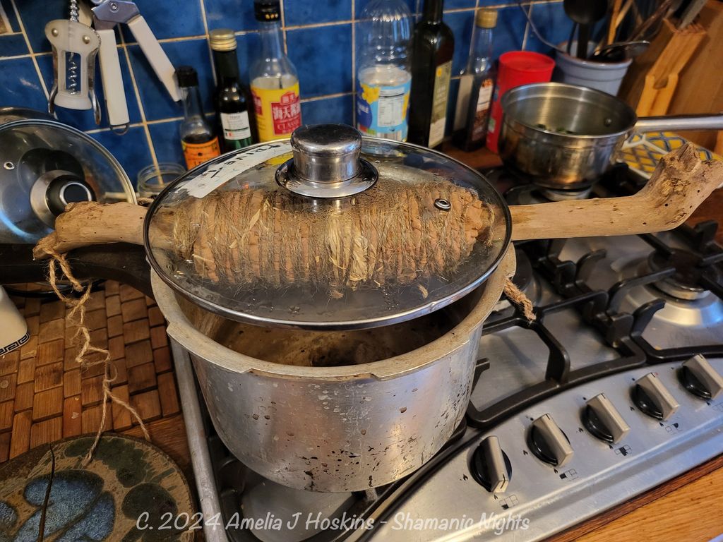 Improvised steaming stick; rose tree root rests across pan.  Sits, or can be tied on.  Length enables handles to turn around.  Bundle was steamed for 5 hours simmered, turning part time, then left in position overnight and opened after 24hrs.
