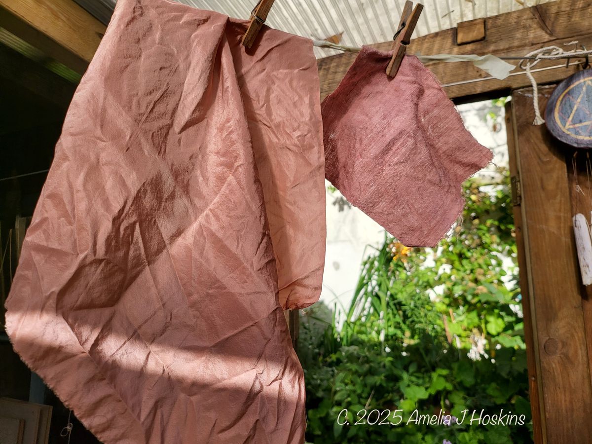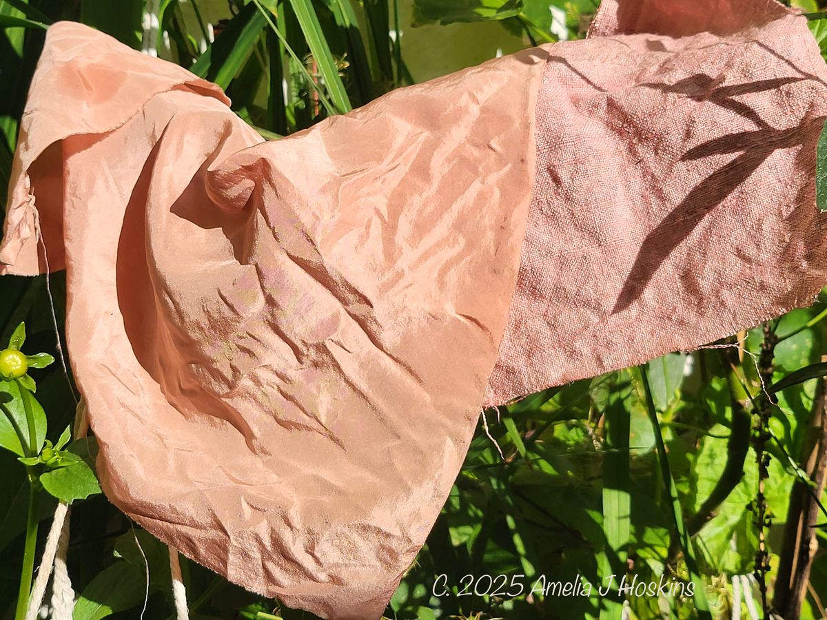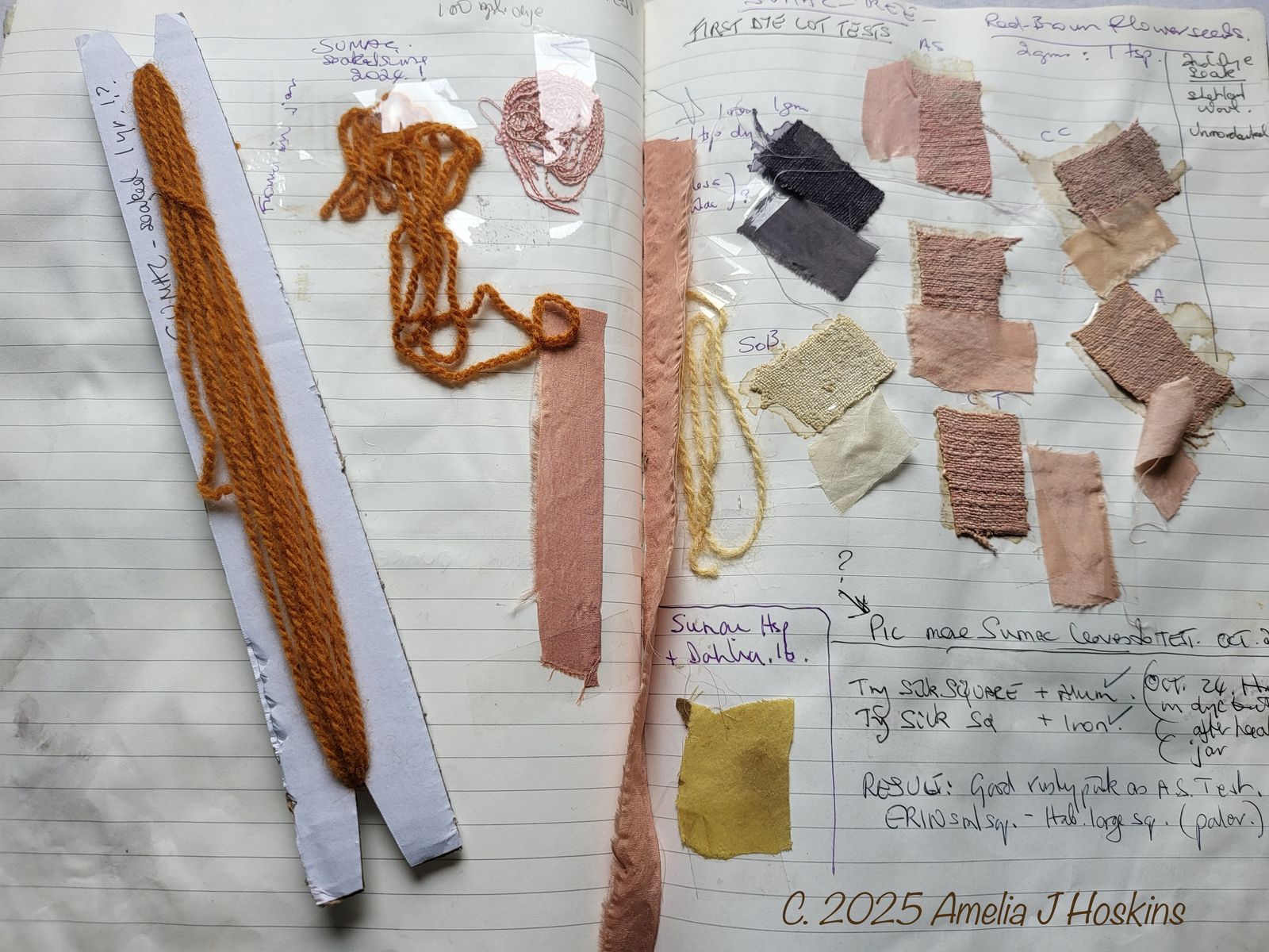 Good strong tones achieved with modifiers. [See notebook image above.] I chose to simply use alum sulphate as a pre-mordant (which matches my silk pieces, although no mordant at all (centre test sample), would be fine. An interesting change from predominant salmon pink, is the pale straw sample, modified with Sodium Bicarbonate, (alkaline). This stops the pink coming through, but Sumac is more valuable for the stronger terracotta pinks.