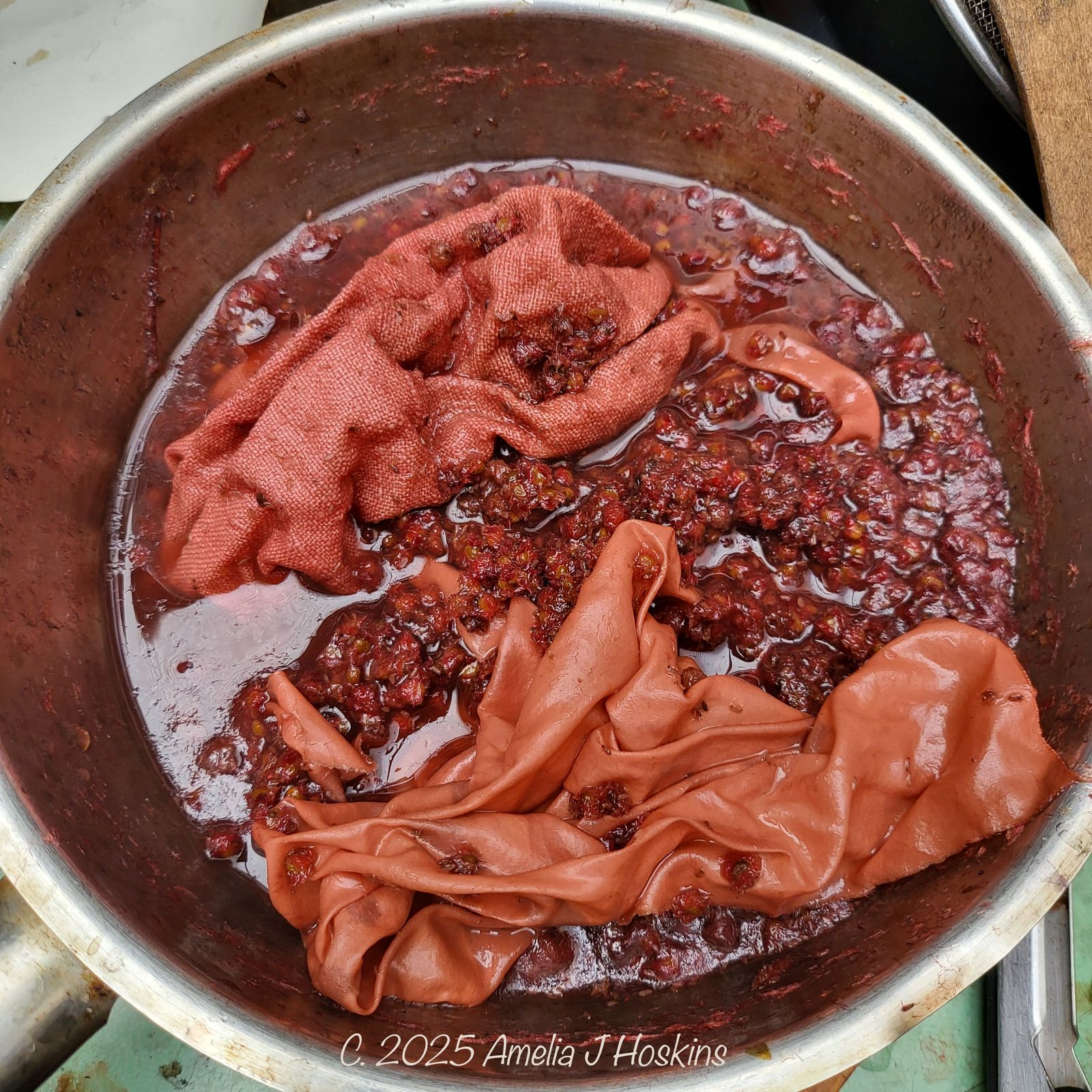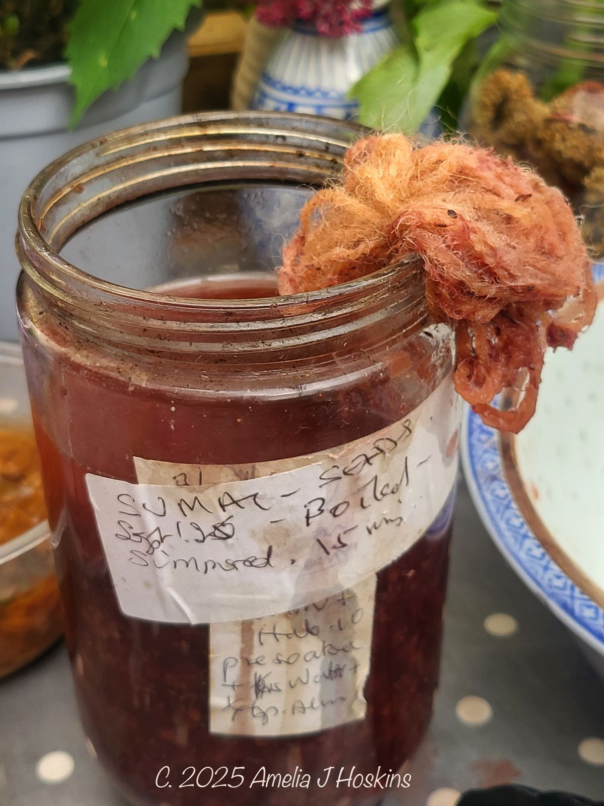 Shetland wool was soaked in dye jar, but probably not mordanted, and has oils in (must be alkaline), which prevented the pink shades. Shetland wool, dyed ginger was found in previous year's jar of Sumac dye! Worth leaving wool in for longer after dyeing silk pieces.