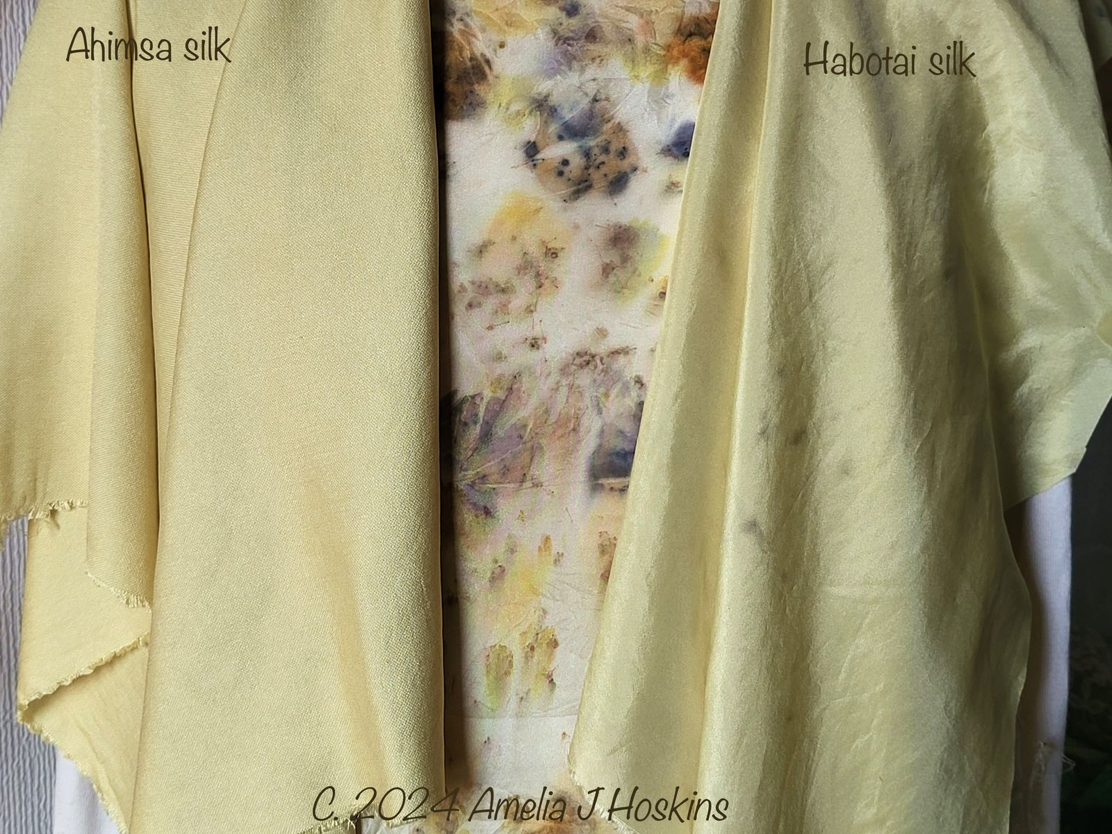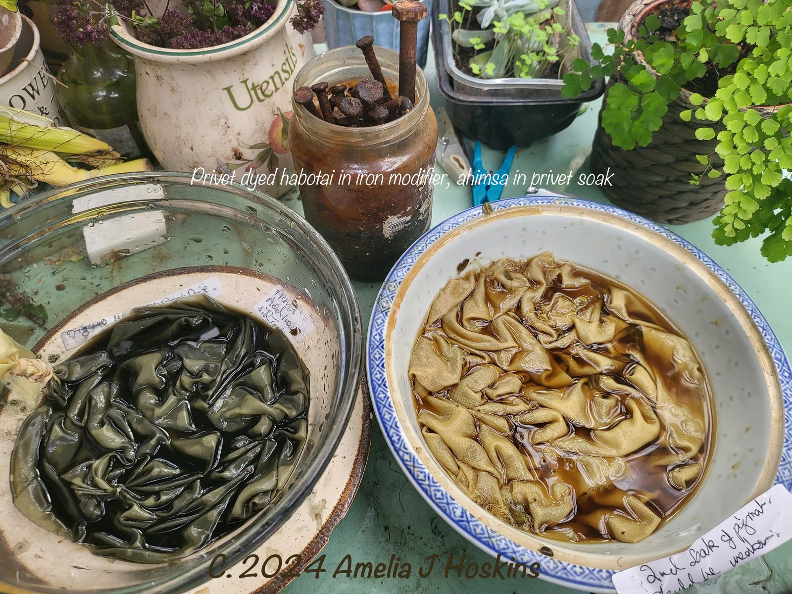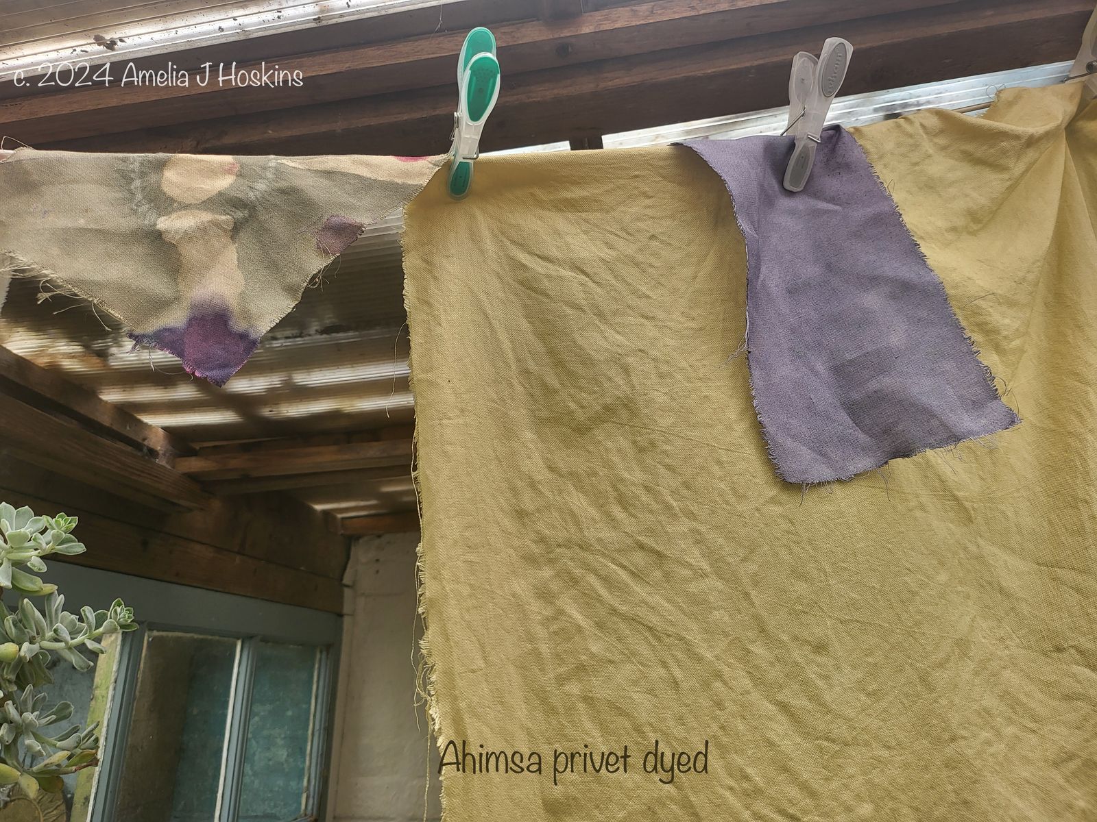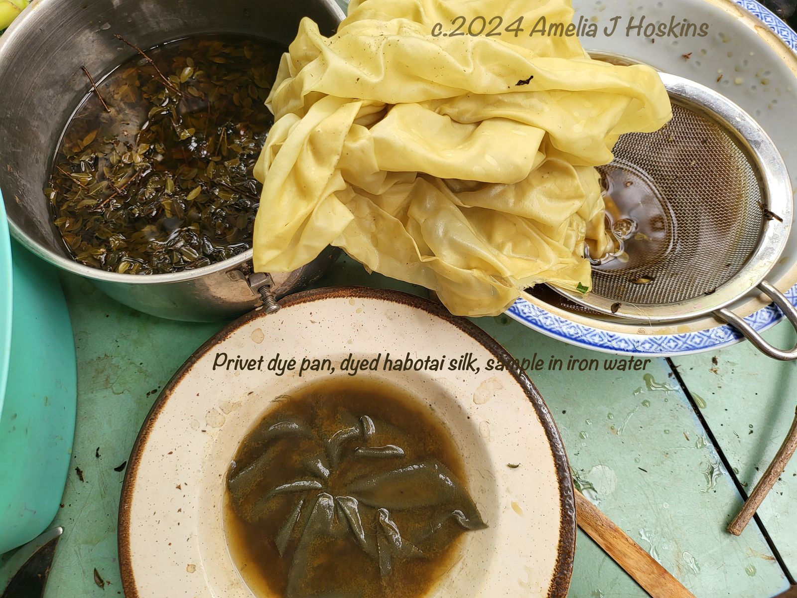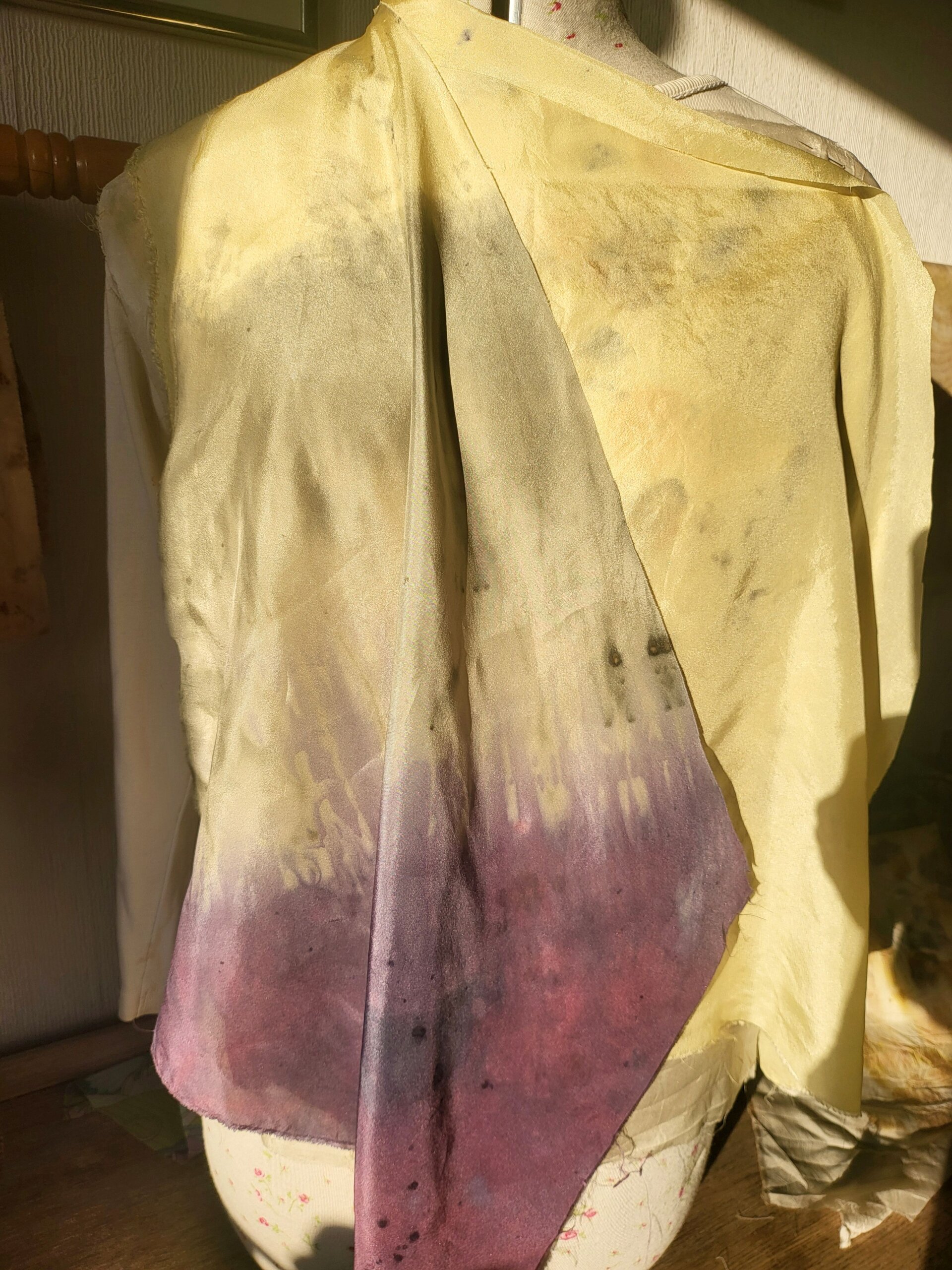 First test results were easy to obtain with steam bundle dyeing process. Two silk pieces: one previously dyed with iron modified blackberry (lavender) and one previously tan dyed from leaves with small orange eucalyptus prints.