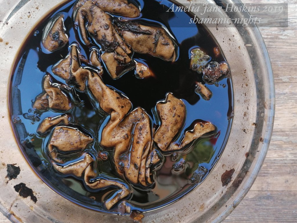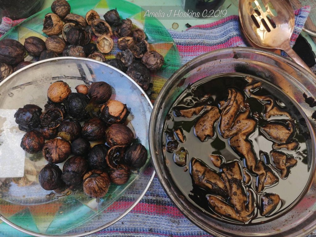 - Walnut husks were soaked for several days before boiling up and simmering until liquid was very dark brown.