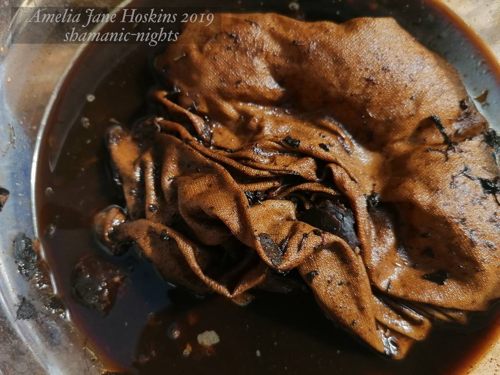 There is a lot of pigment left in the dye bath which can be stored in jars or used for additional fabrics. Fill to brim to avoid mould forming. It could also be used to add to jars of cream/gold dyes to strengthen tone. At this stage it would be good to investigate what might be added to the bath, to change the colour of what pigment is left. I was tempted to add some madder dyestuff for a dark red (purchased, not foraged), and this remains to be tested.